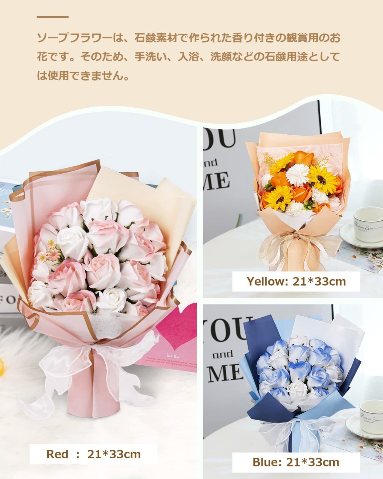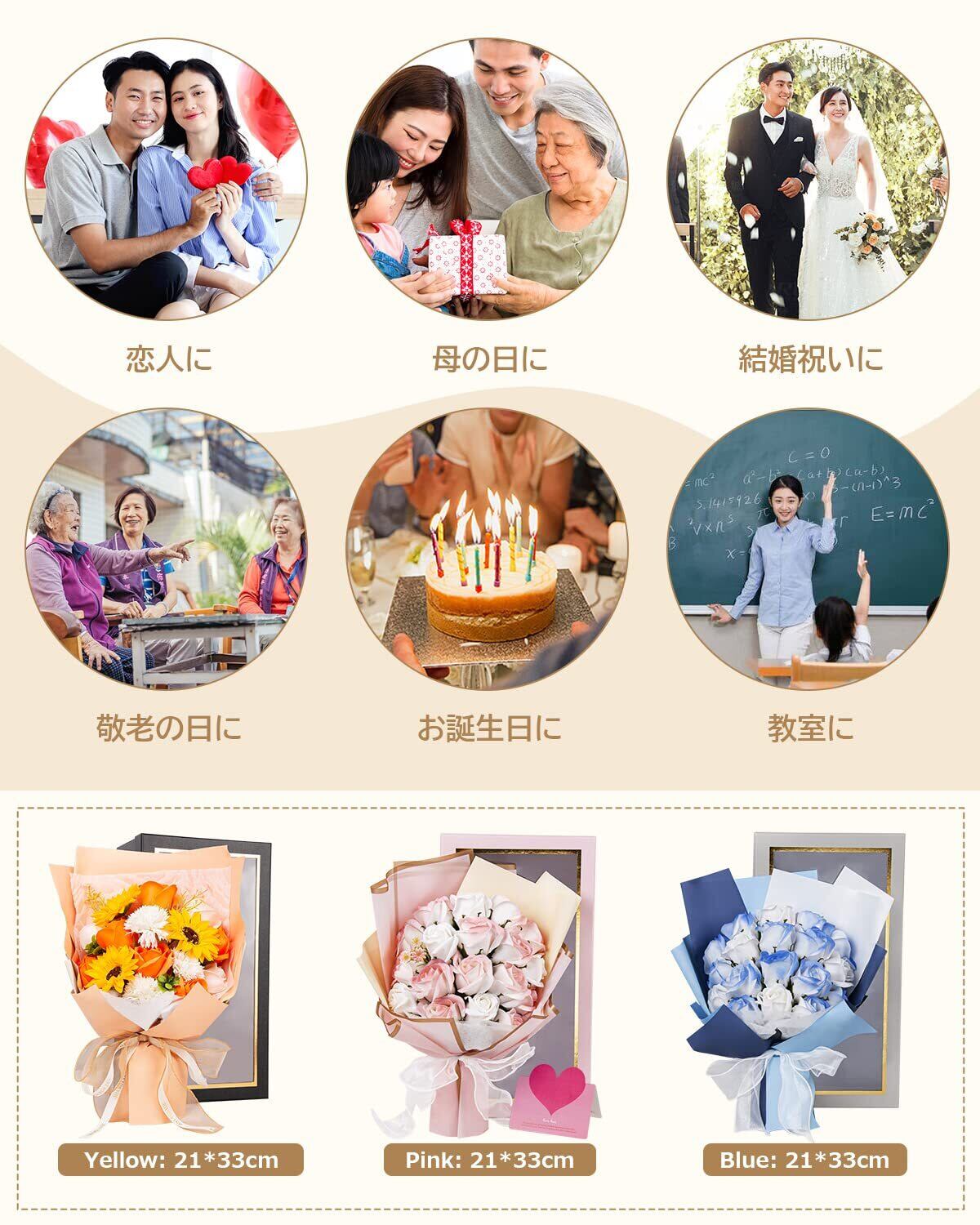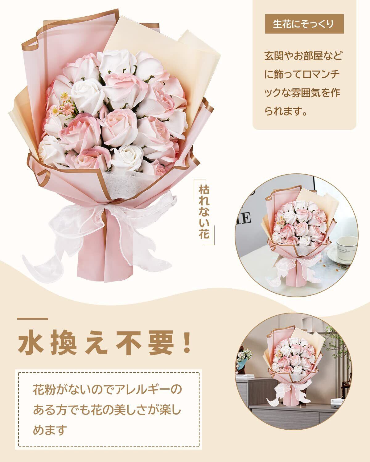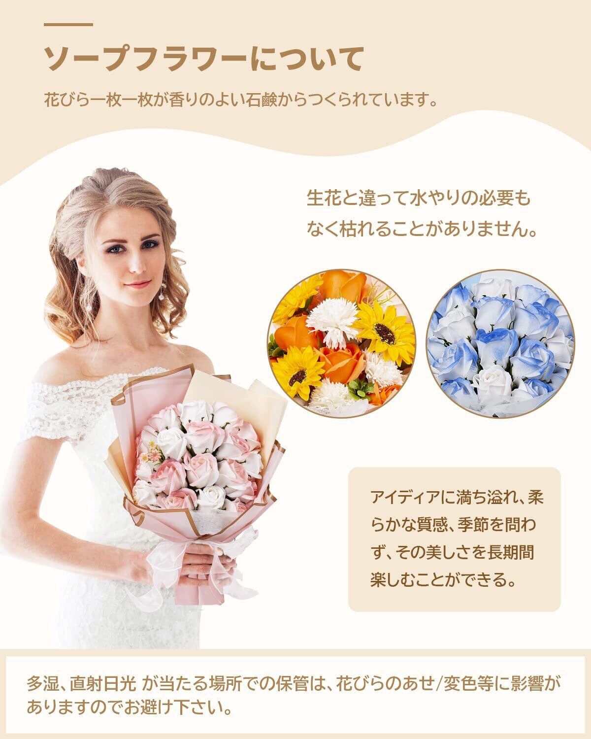 【様々なプレゼントに最適】高品質な石鹼素材で作られた優しい香り付きの観賞用ソープブーケ、花びらの数や咲いた姿も自然に成長するお花の特性に従ってつくられます。お誕生日プレゼント・開店祝い・新築祝い・結婚祝い・結婚記念日・出産祝い・歓送迎会・記念品・卒業祝い・入学祝い・お世話になった方へ・退職祝い・送別会・内祝い・お返し・自宅用・贈答用・記念日・母の日・父の日・敬老の日・お見舞い・お中元・お歳暮・クリスマス・バレンタインデー・ホワイトデーなどのフラワーギフトに最適です。
