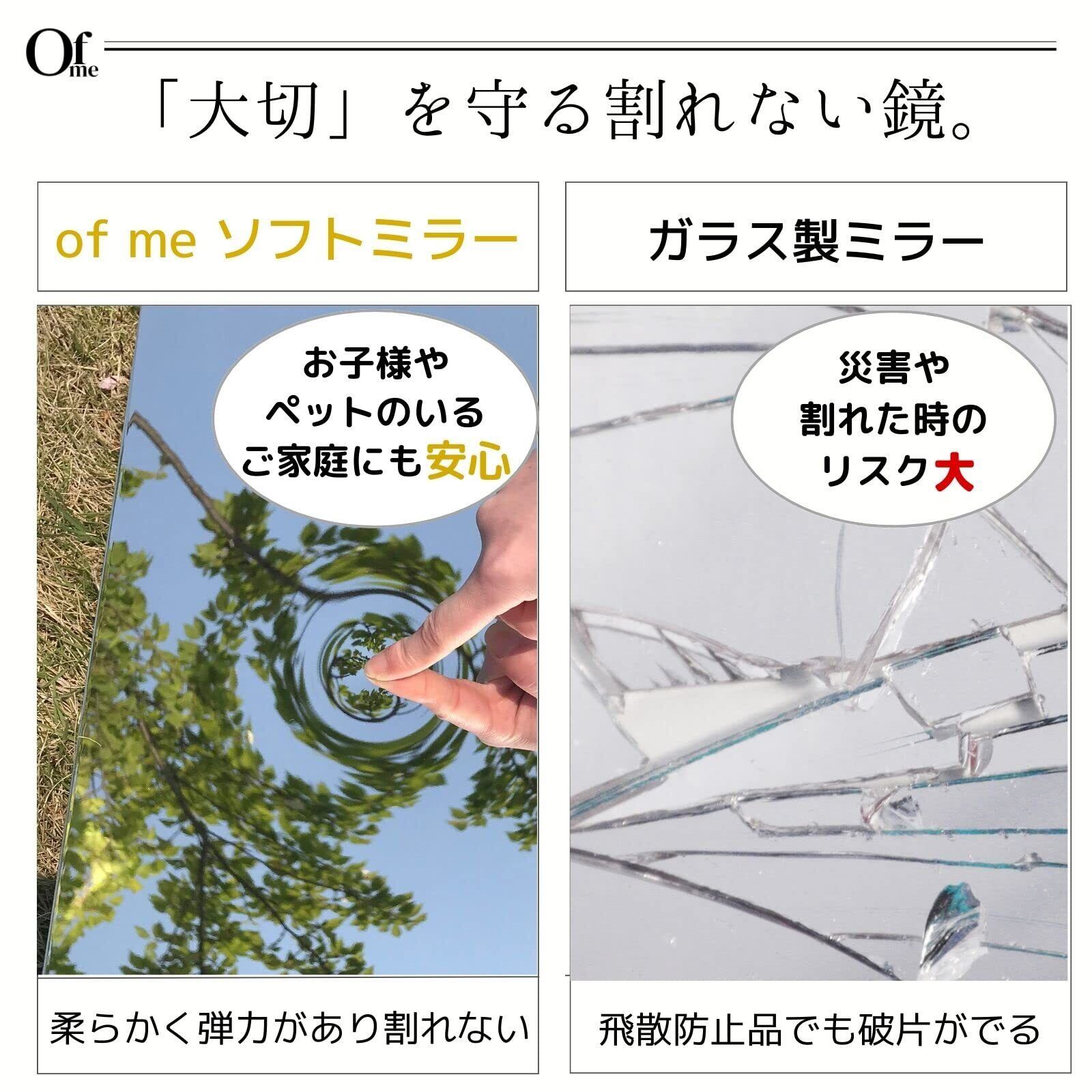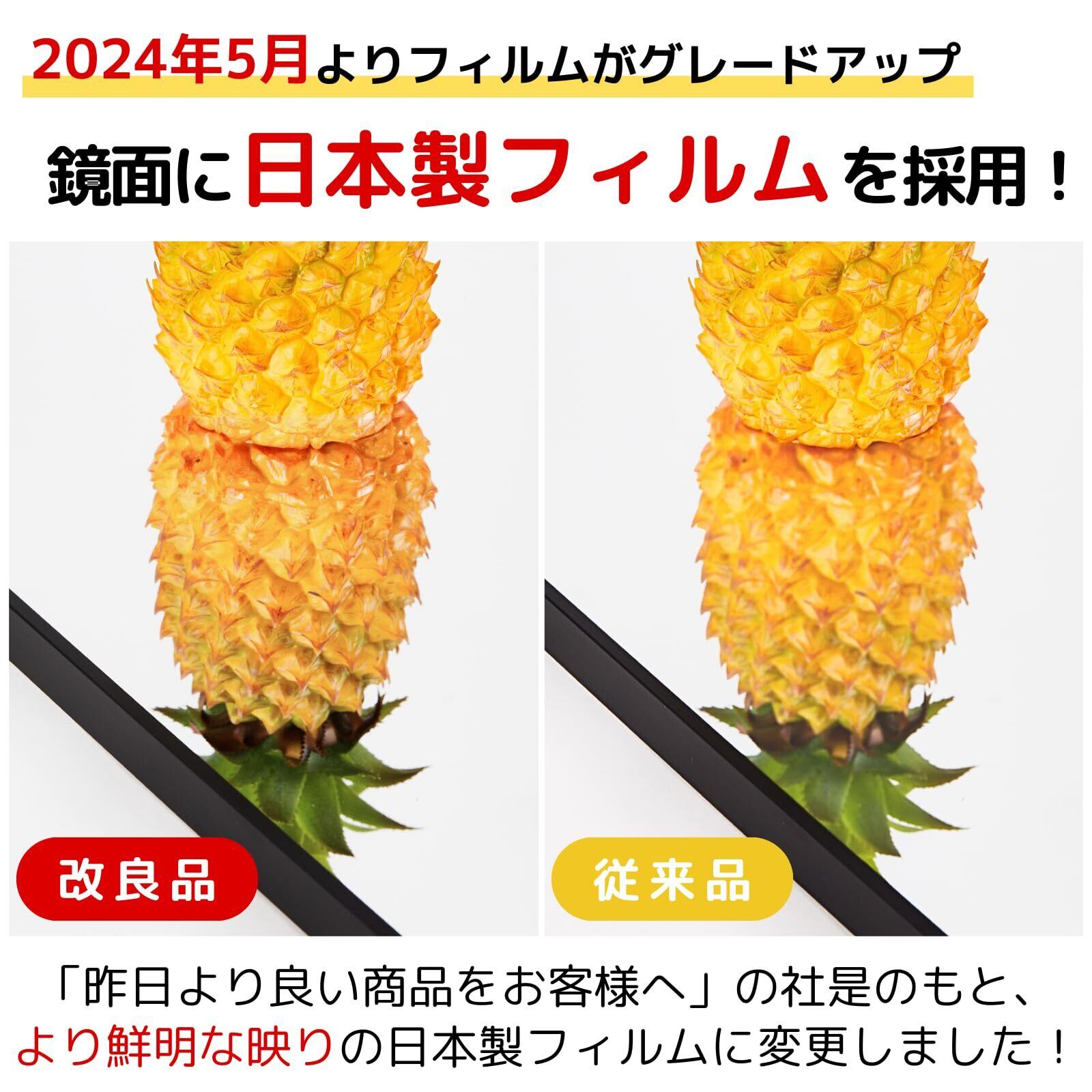 【鮮明な色の再現】 従来のガラス製ミラーは鉄や鉛を含んでいる為、どうしても緑がかってしまいます。 本商品は「高透過フィルム」を鏡面に採用することで、緑がかることなく、色彩をより鮮明に再現が可能◎ 顔色や肌の色を正しく映し出すので、健康管理や化粧直しにも役立ちます。