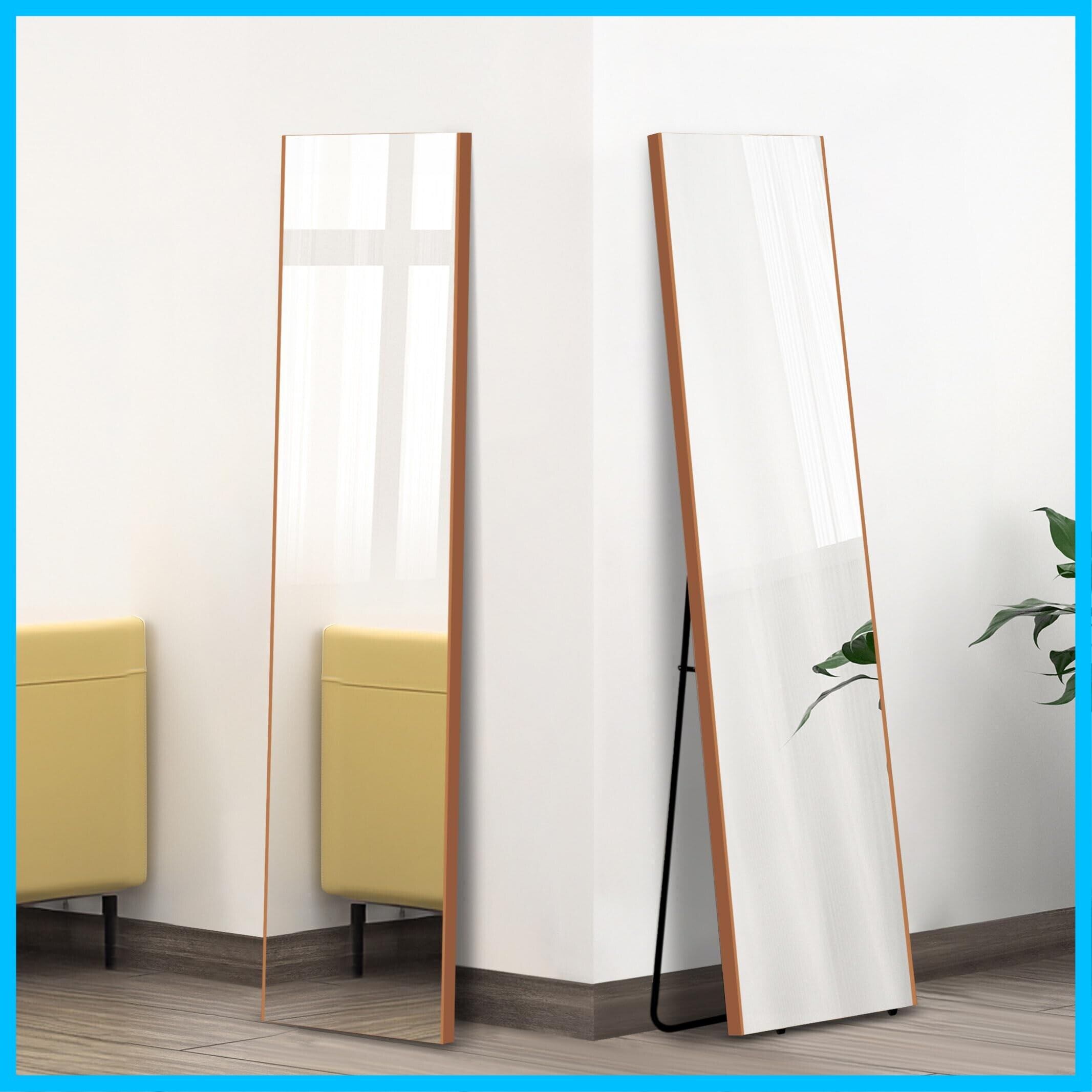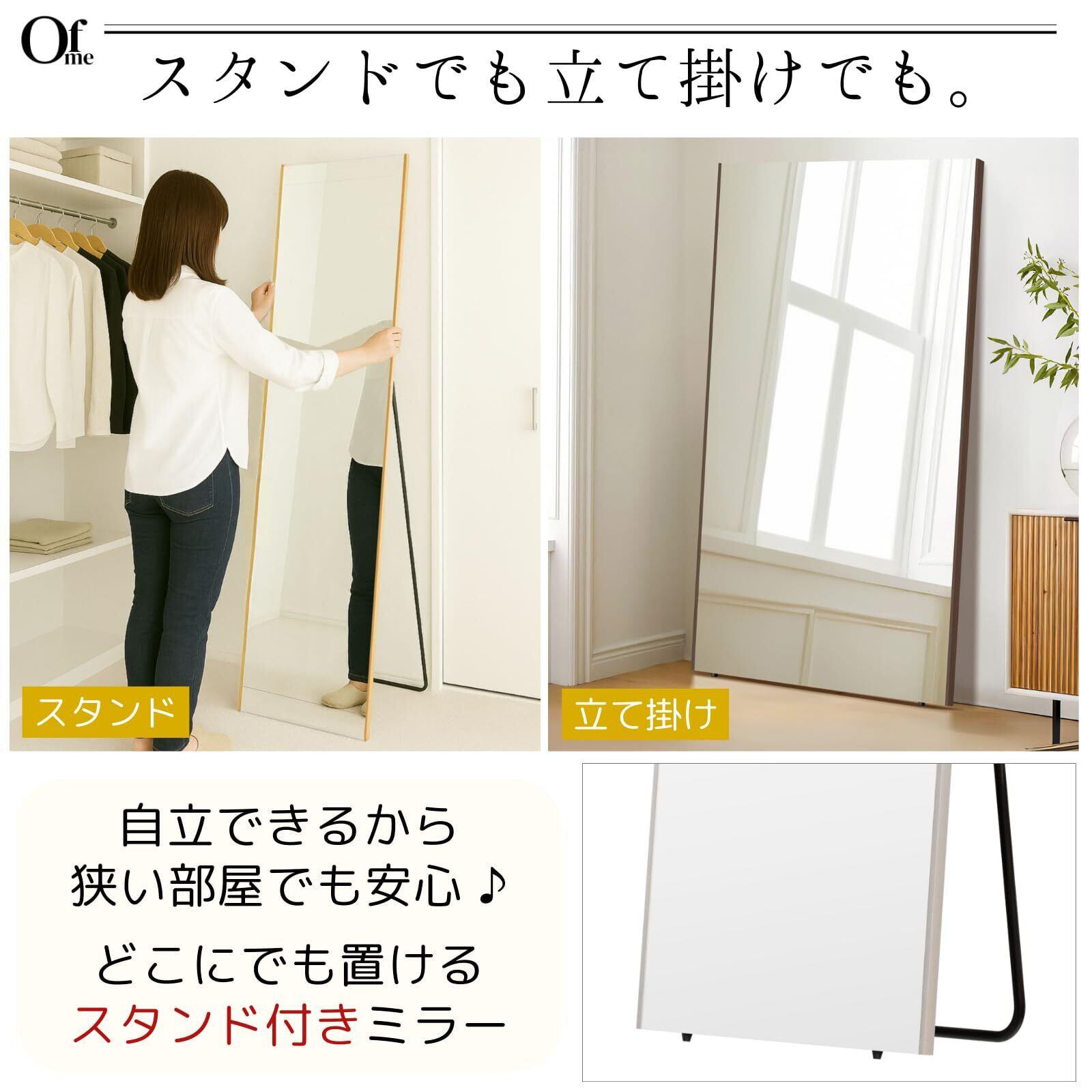 ofme 割れない スタンドミラー 軽量 薄型 日本製鏡面フィルムミラー 姿見鏡 全身鏡 150×30cm ナチュラル 木目 自立式 立て掛け 防災 地震対策 ヨガ 筋トレ