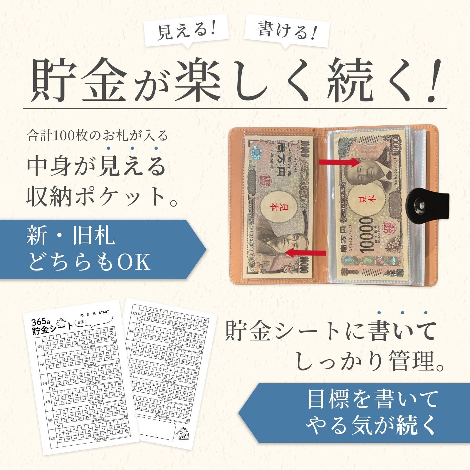 【見える収納×書いて管理】 中身が一目で分かる透明ポケット仕様のお札 貯金箱。新札・旧札どちらにも対応し、合計100枚まで収納できます。付属の貯金シートは目標金額や貯金日を書き込める設計で、貯金手帳のように管理可能。見える化することで達成感が生まれ、楽しくお札貯金を続けられます。