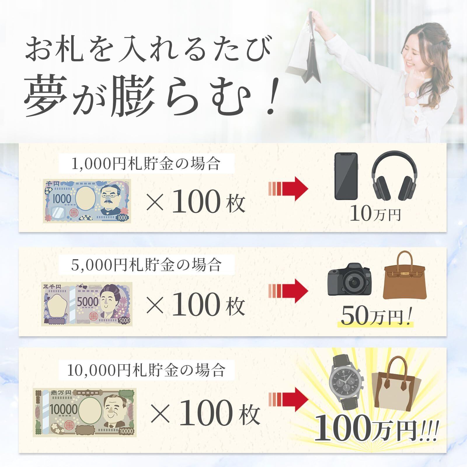 【100万円を目指せるお札貯金箱】 最大100枚のお札を収納できる、手帳型のお札 貯金箱。千円札なら10万円、五千円札なら50万円、一万円札なら100万円と、目標金額に合わせた貯金が可能!硬貨よりも金額を意識しやすく、貯金のモチベーションを保ちやすいのが特長です。シンプルなカラーと耐久性のあるPUレザー素材を採用し、毎日使っても飽きにくく、長くお使いいただけます。