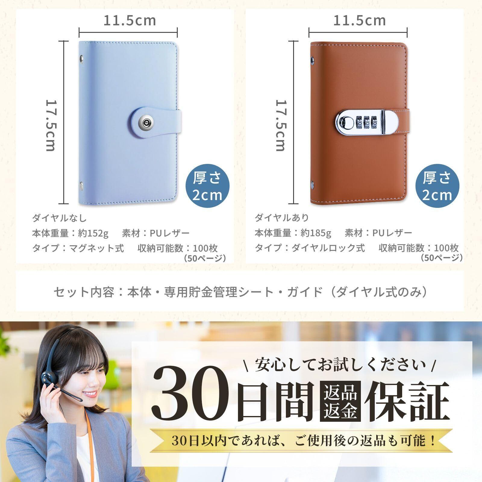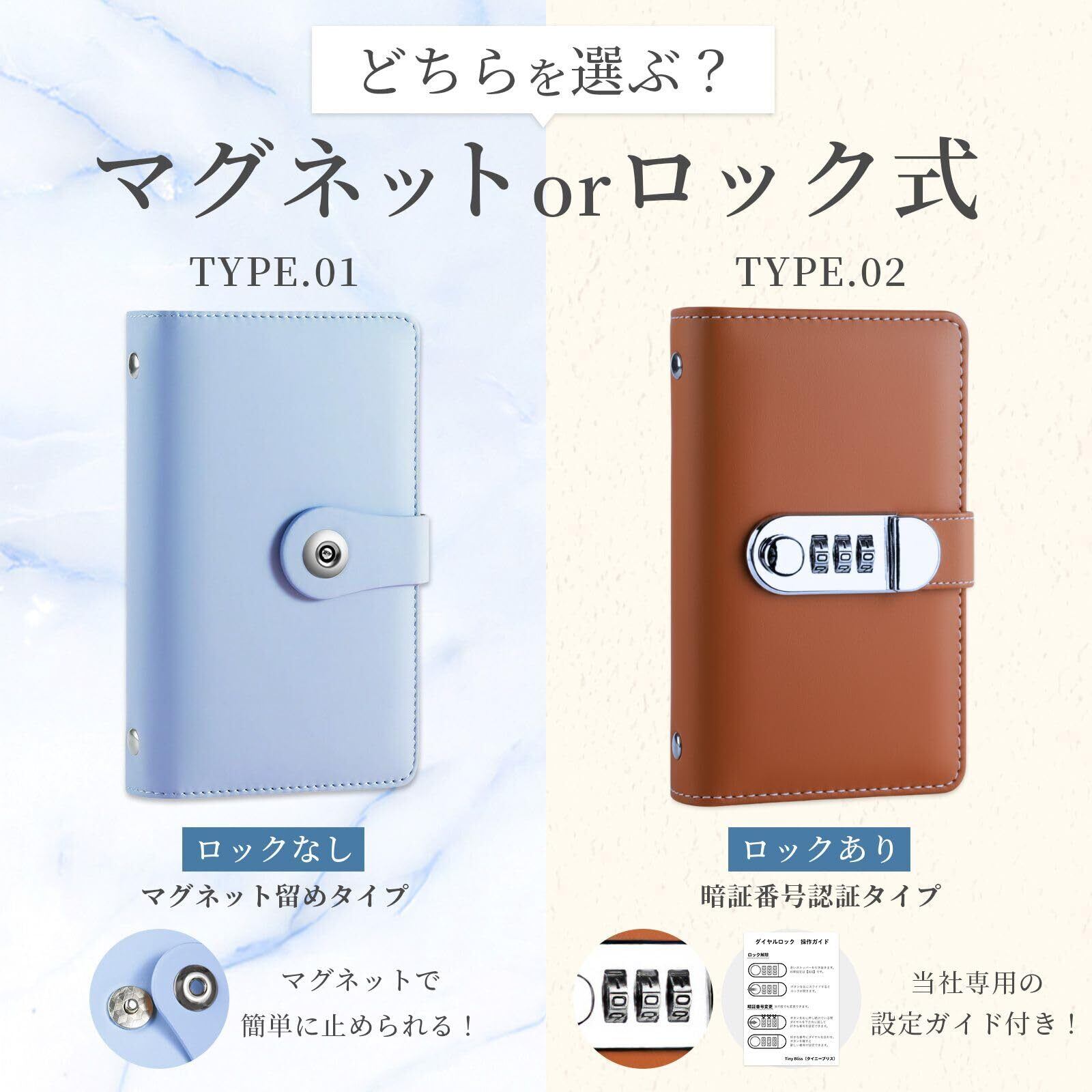 【選べる2つのタイプ】 マグネットで開閉できるタイプと、ダイヤルロック付きタイプの2種類をご用意。ダイヤルロック式は当社オリジナルの暗証番号設定ガイド付きで、初めての方でも簡単に設定できます。用途に合わせて選べるほか、各タイプ8色展開なので、好みに合わせてお選びいただけます。