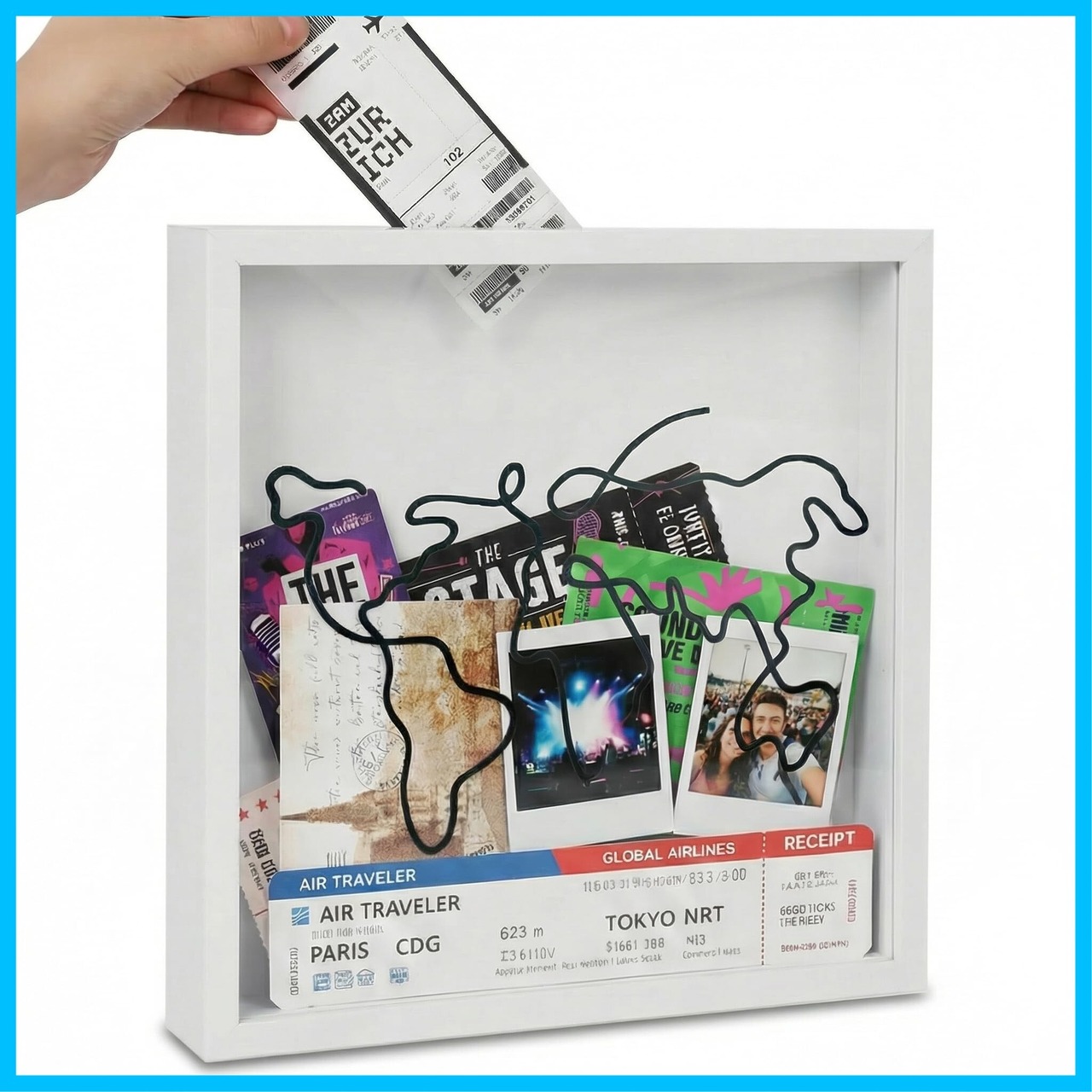 【旅の思い出フレームとして最適】 フレーム上部のスロットからアーカイブボックス チケットを投入するだけの簡単設計。旅の思い出 フレームとして、旅行先で集めた航空券、入場券、ポストカードを帰宅後にポイッと入れるだけで、楽しかった記憶が層になって積み重なります。
