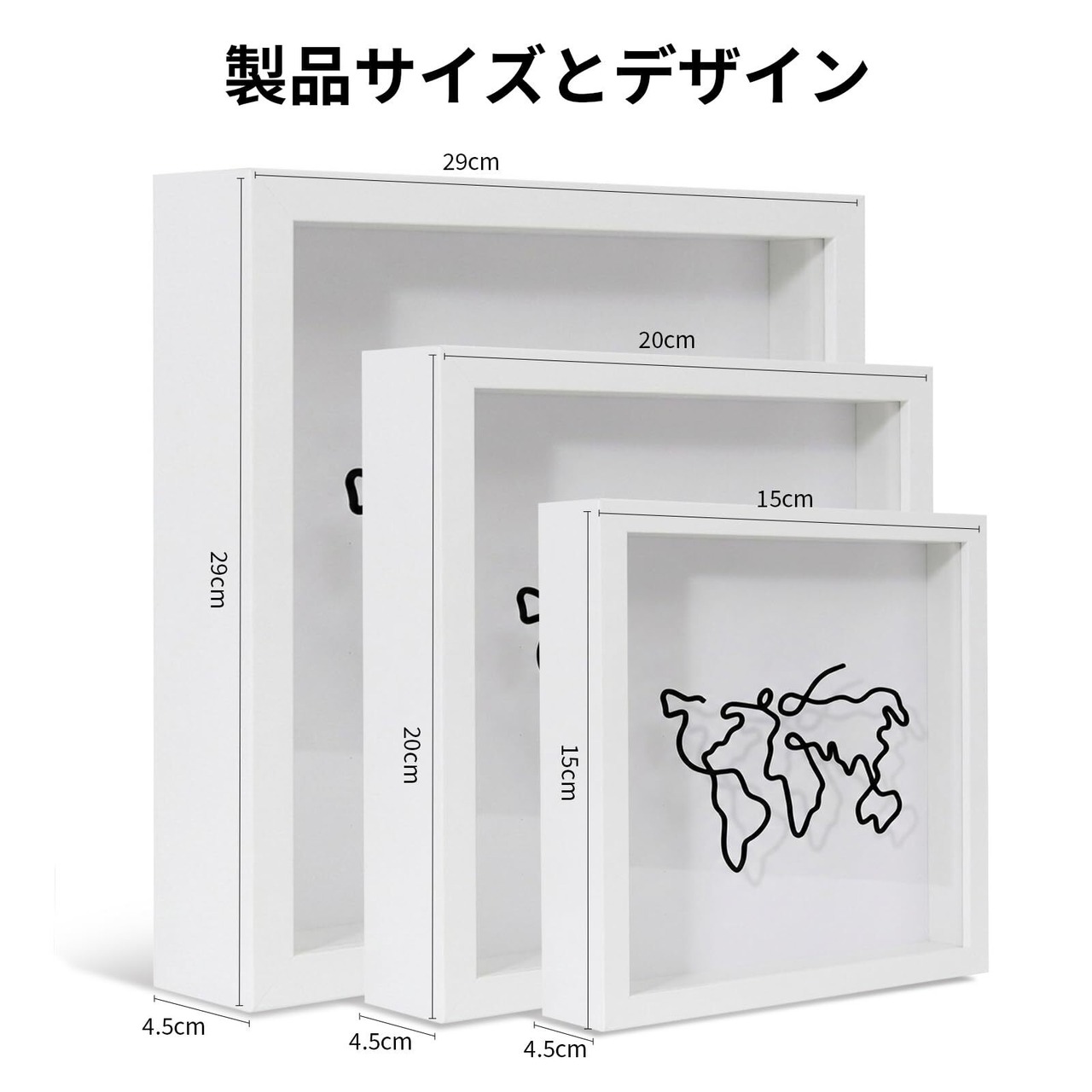 【3サイズから選べるボックスフレーム】 用途に合わせて選べるS(15×15cm)、M(20×20cm)、L(29×29cm)の3サイズを展開。厚みのあるボックスフレームなので、立体的な小物も余裕を持って飾れます。増え続けるグッズのアーカイブボックス 収納としても活躍し、スペースや飾りたい量に合わせて最適なサイズをお選びいただけます。