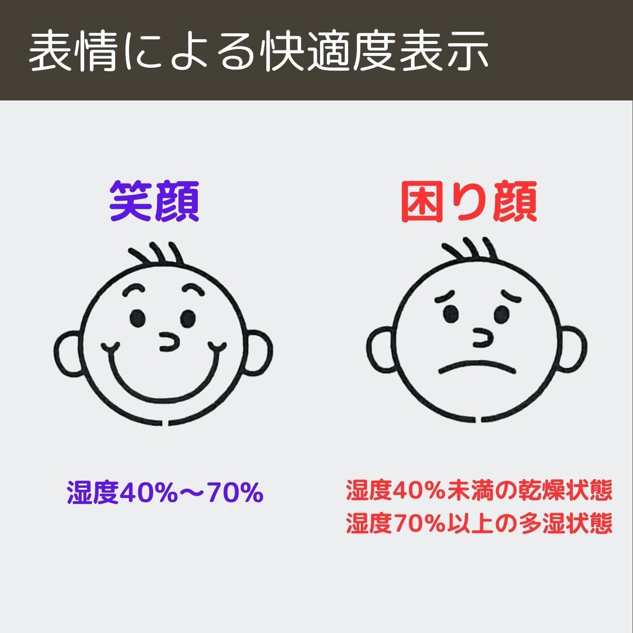 【健康管理に役立つ快適度の顔表示付き】湿度による快適度の顔表示付き。快適度顔表示で、冬場の乾燥を視覚化する、真夏の危険な高湿度を認識する等、誰でも容易に実現可能です。