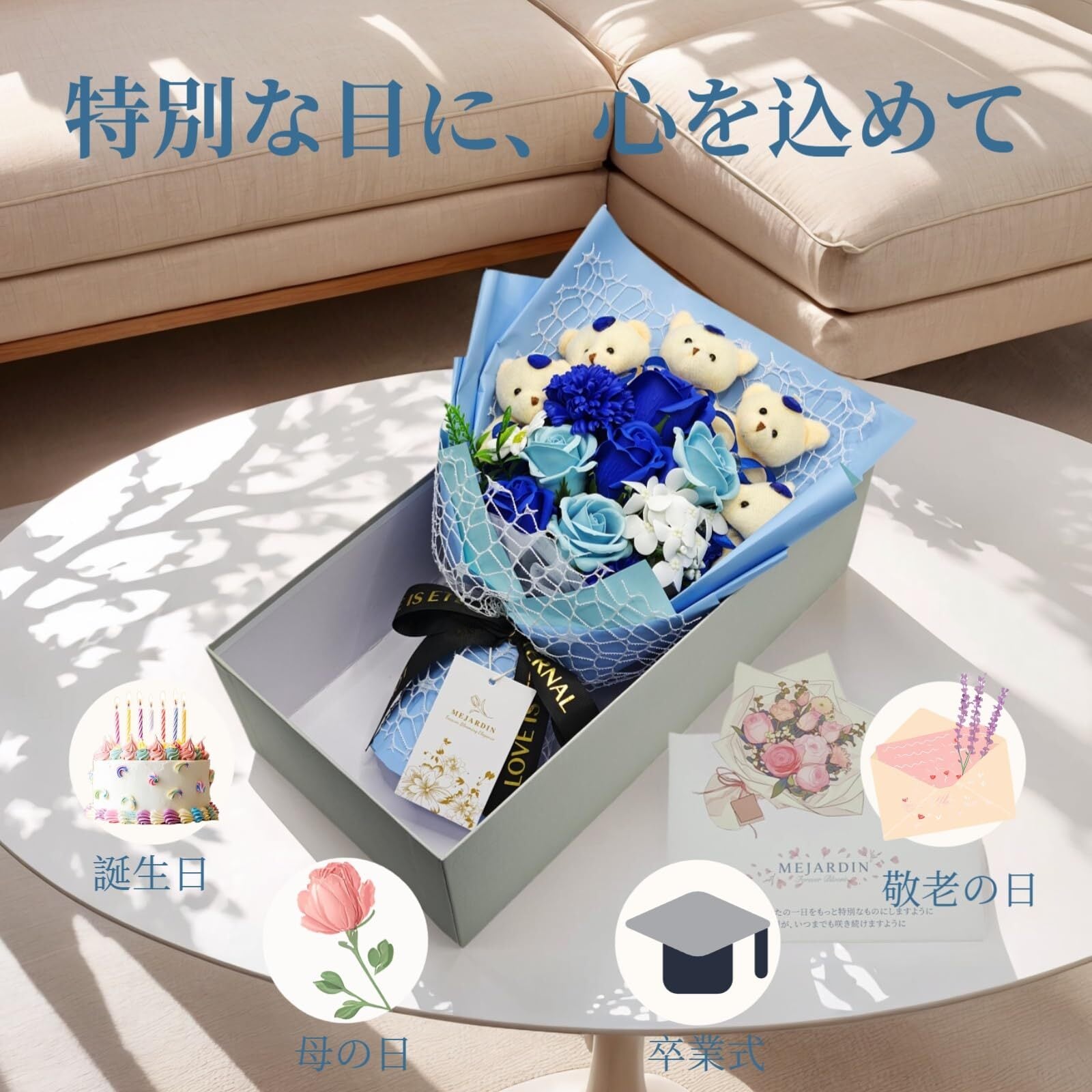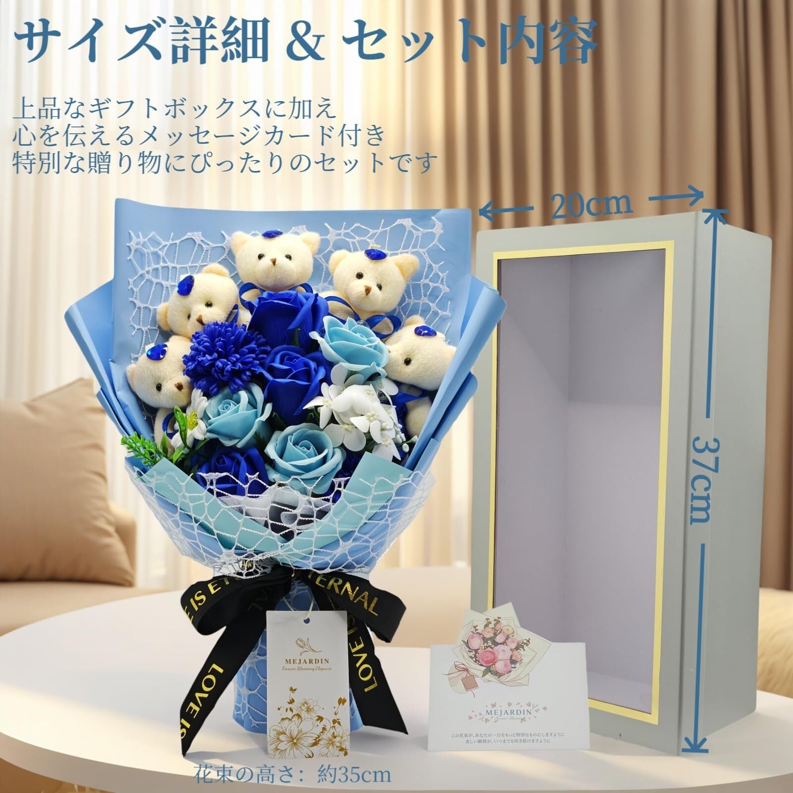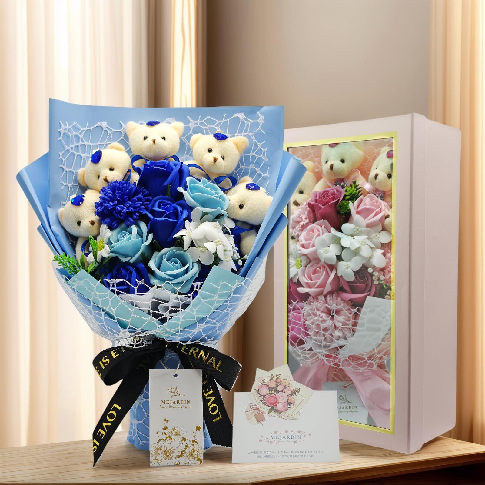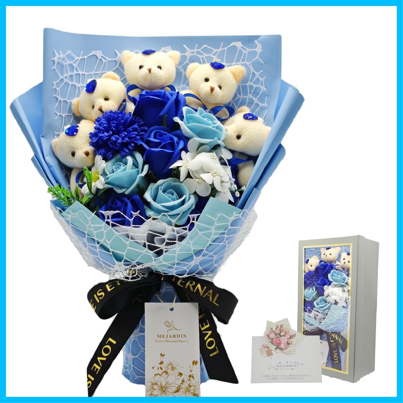 ソープフラワー 花束 可愛いくま バラ 造花 ブーケ 枯れない花 誕生日 母の日 卒業式 記念日 敬老の日 お祝 プレゼント 退職祝い 女性 結婚 発表会 ギフト フラワー flowers bouquet, 青