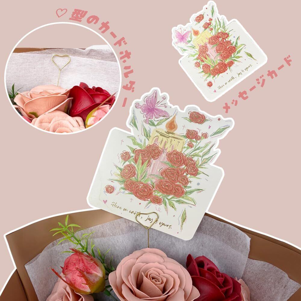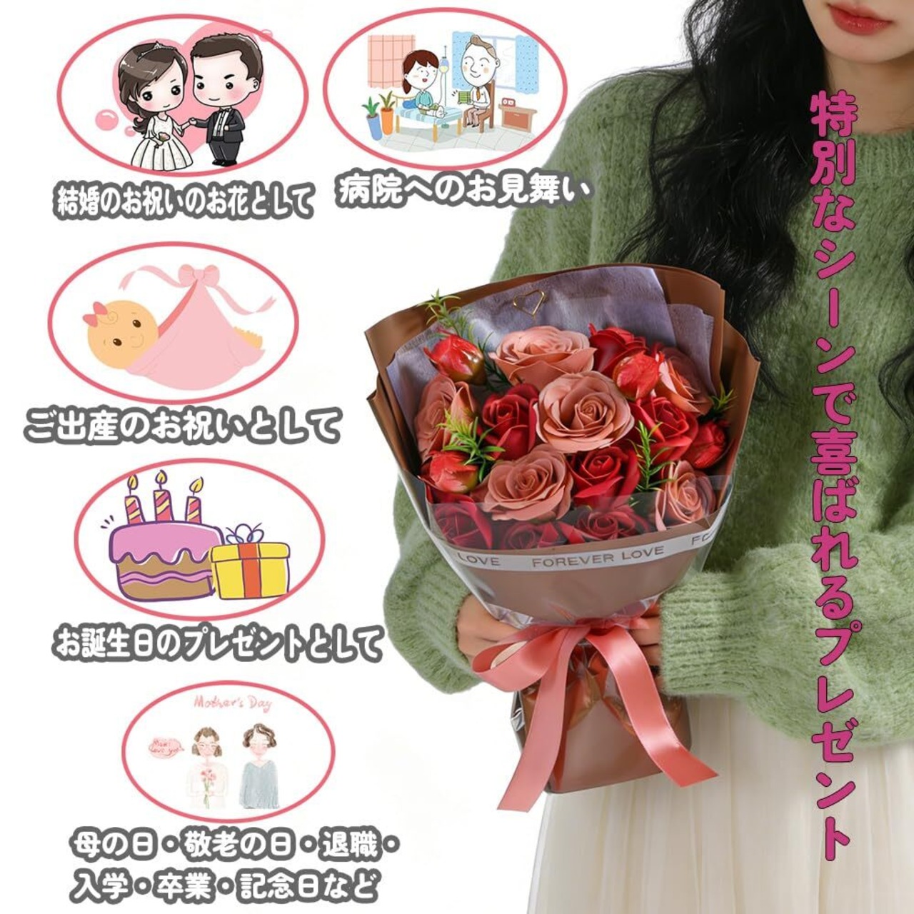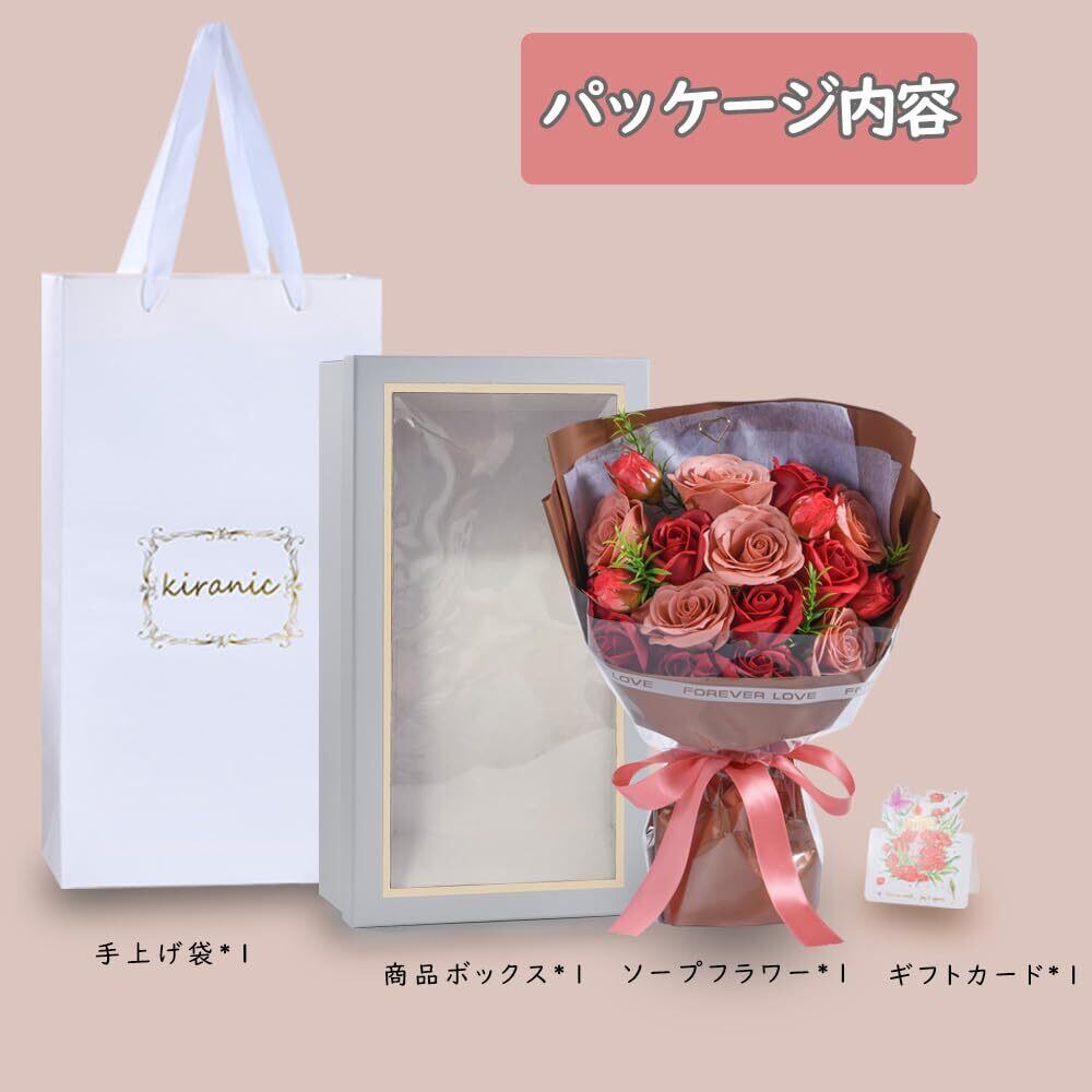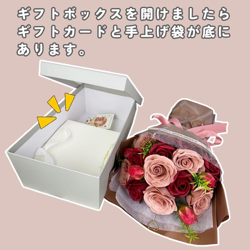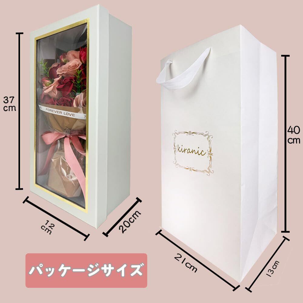 ✿【仕様・パッケージ内容】ギフトボックスサイズ:長さ37㎝*幅20㎝*高さ12㎝;材質:石鹸 ;花色:赤い系 パッケージ内容*1:花束+手上げ袋*1+窓付きギフトボックス*1+メッセージカード*1