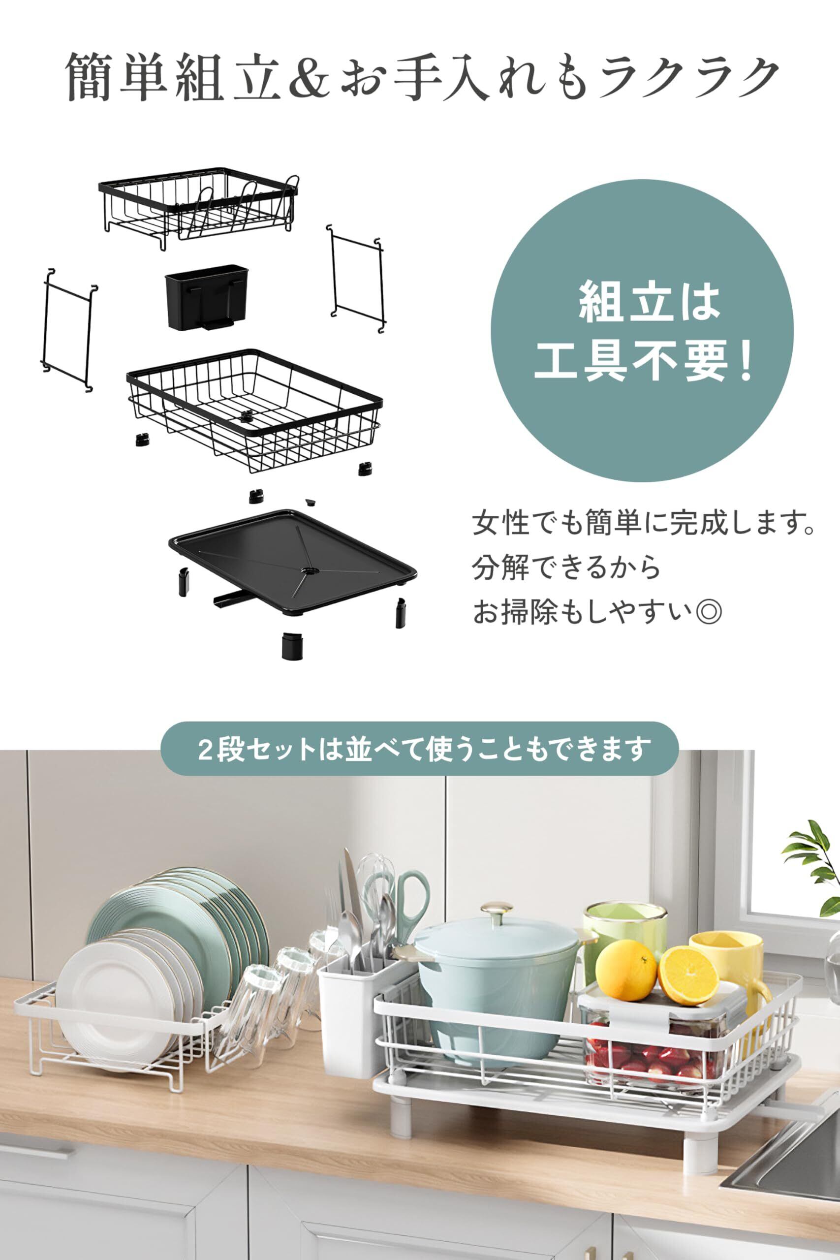 【組み立て簡単&使いやすい】シンプルな構造の食器用水切りかごなので、組み立ても簡単。色はホワイトとブラックをご用意。ご自宅のキッチンの雰囲気に合わせてお選びいただける水切りラックです。さらに、分解して洗えるので、お手入れもラクラク。キッチン用水切りとして長く愛用でき、毎日の洗い物を快適にする食器ラックです。