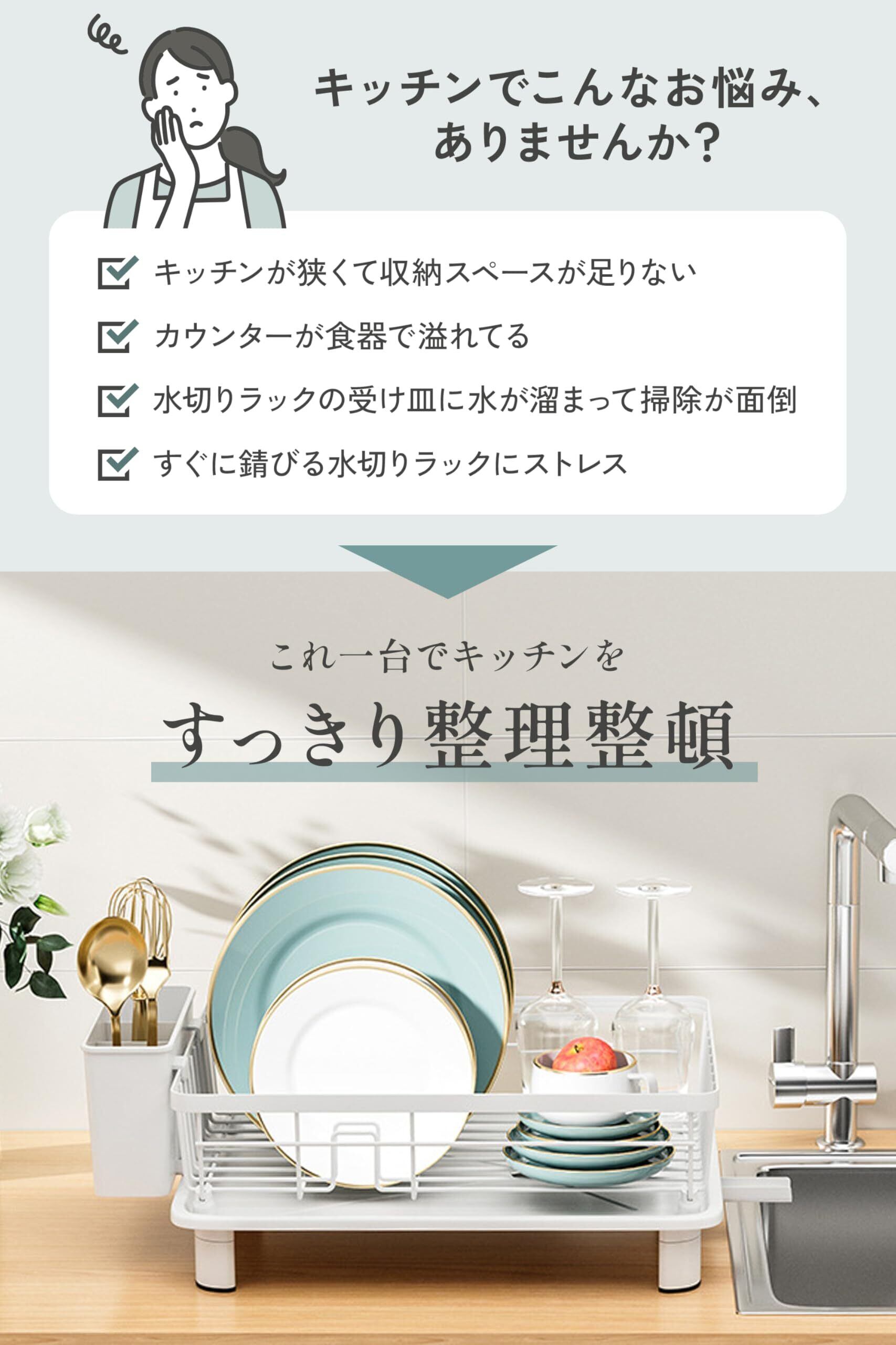 【安定感抜群の設計】しっかりとした構造で、食器を載せてもぐらつきにくい設計の食器水切りラック(キッチン用水切り)です。カトラリーを入れる所( 箸立て )と、コップを掛ける所は別になっているので水切り時にお皿と干渉する心配もありません。 日々の洗い物をしっかり乾燥できる水切りカゴです。