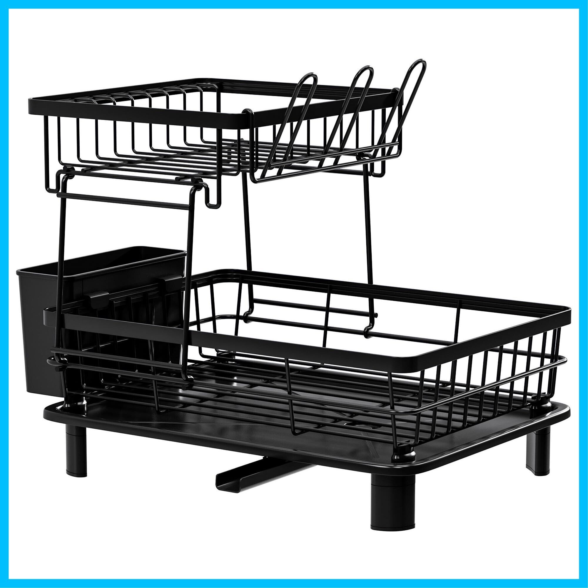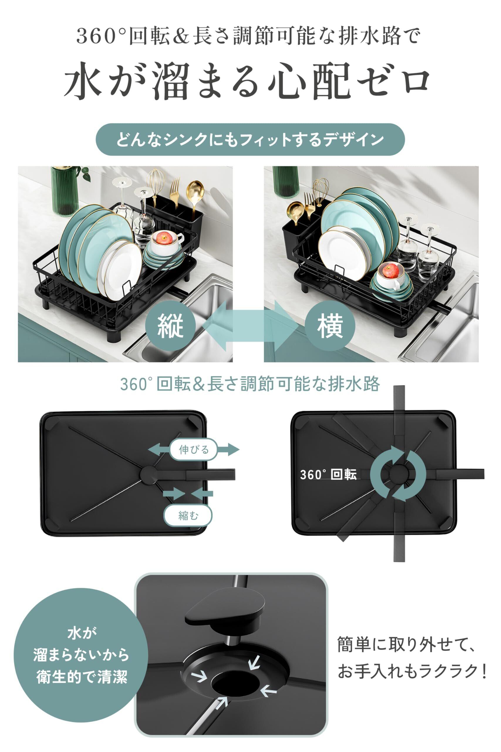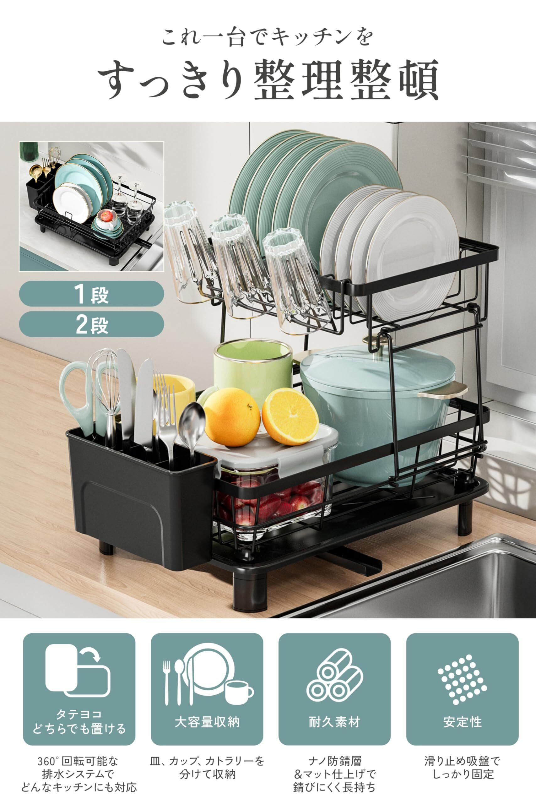 水切りラック 360°排水で水が溜まらず衛生的 シンクが広く使える 箸・コップ・お皿もこれ一台ですっきり (ブラック 2段)