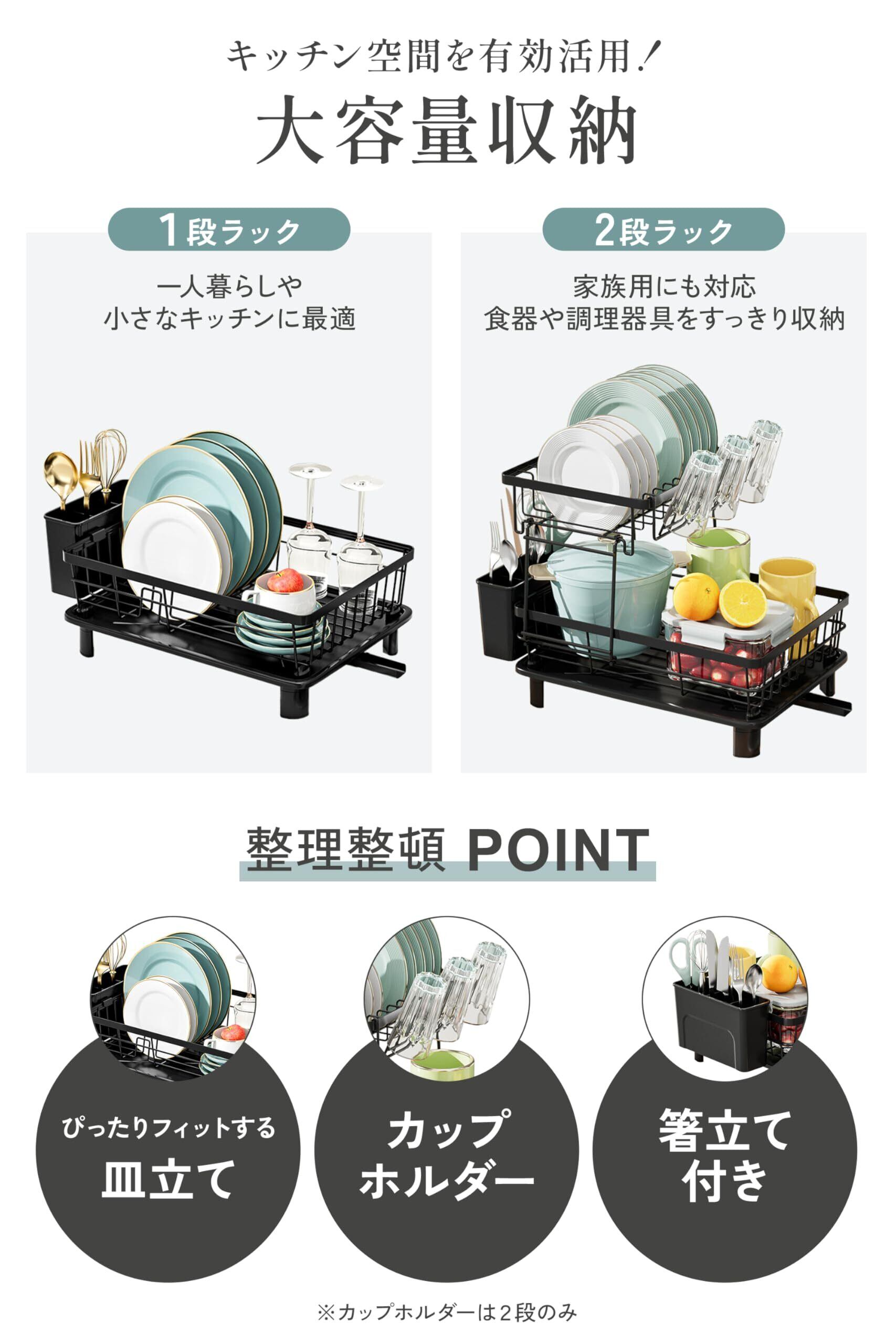 【大容量で省スペース】縦型構造のため多くの食器を収納でき、限られたキッチンスペースを有効活用。調理スペースを確保しやすくなります。水切りカゴにはしっかりとしたフレームを採用し、安定感も抜群。コンパクトながらも大容量で、家族分の食器をしっかり収納できる食器水切りラックです。分割してそのまま整頓できる2段式の水切りラックもご用意しております。