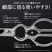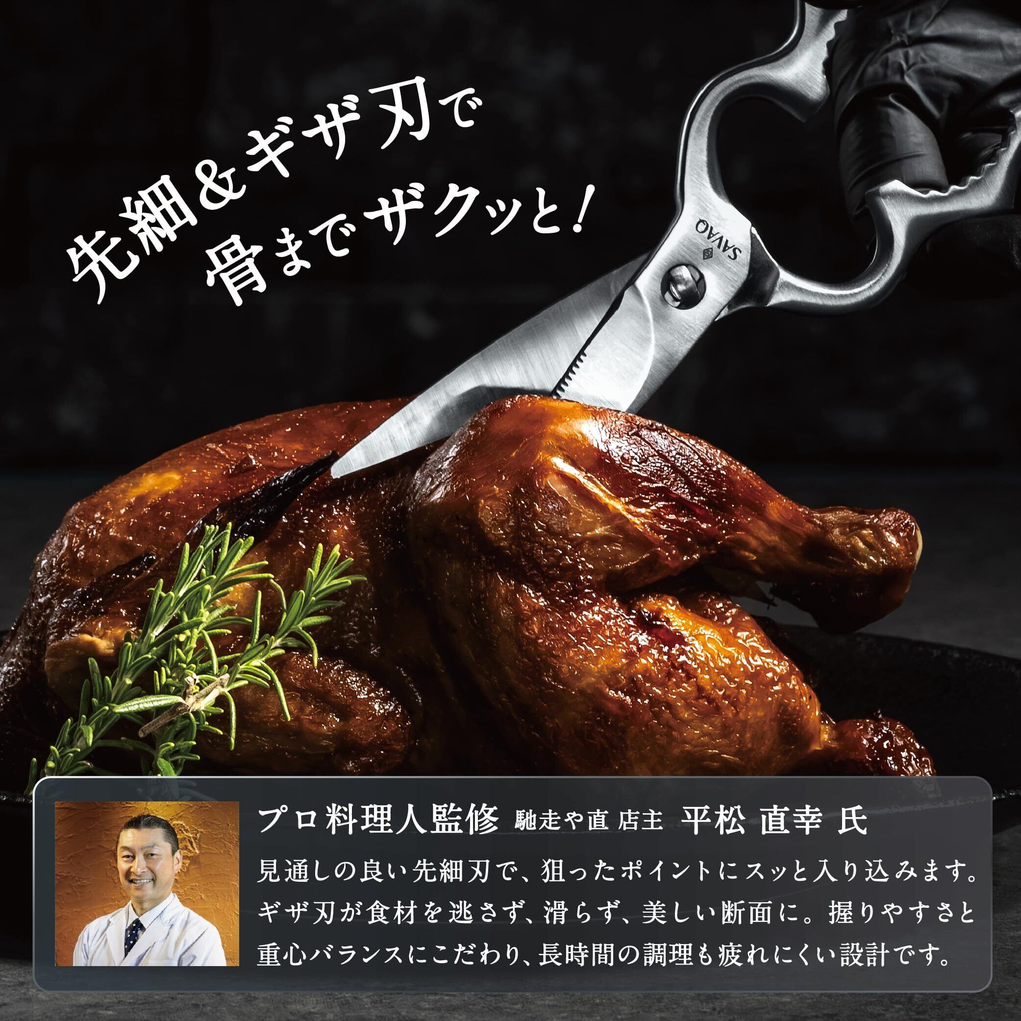【至極の断ち心地】 先細刃とギザ刃加工で狙ったポイントを的確にカットでき、食材の断面も綺麗な切り口に。 また、硬度の高いステンレス素材を使用しているので耐久性に優れ、硬いお肉の筋や骨、乾物系も簡単にカットできます。