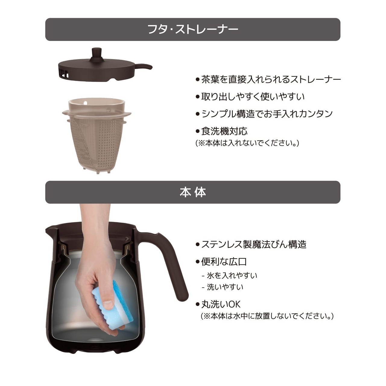 ●つくった飲みものをそのまま保温・保冷できる●茶葉が直接入れられるストレーナー付き