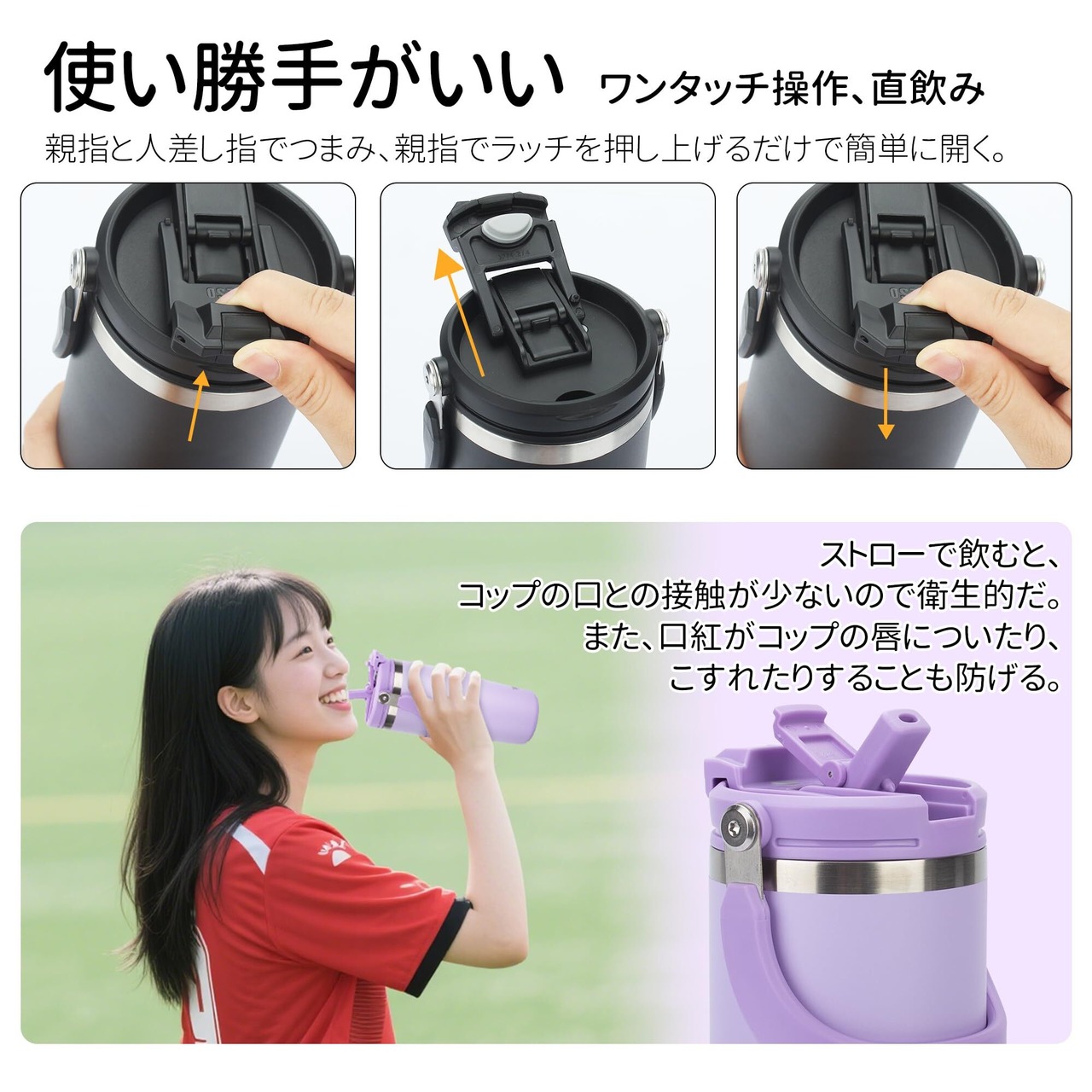 [ワンタッチで開閉!進化型キャップ & 完全防漏設計] 蓋には「プッシュ&ピンチロック」が付いており、押すだけでロックが解除される。簡単に開閉できる、確実な密閉で完全防漏を実現。さらに、ストローが外れない内蔵シリコン栓付きで、中身のこぼれやストローの落下を強力に防止します。車内やバッグの中でも安心です。