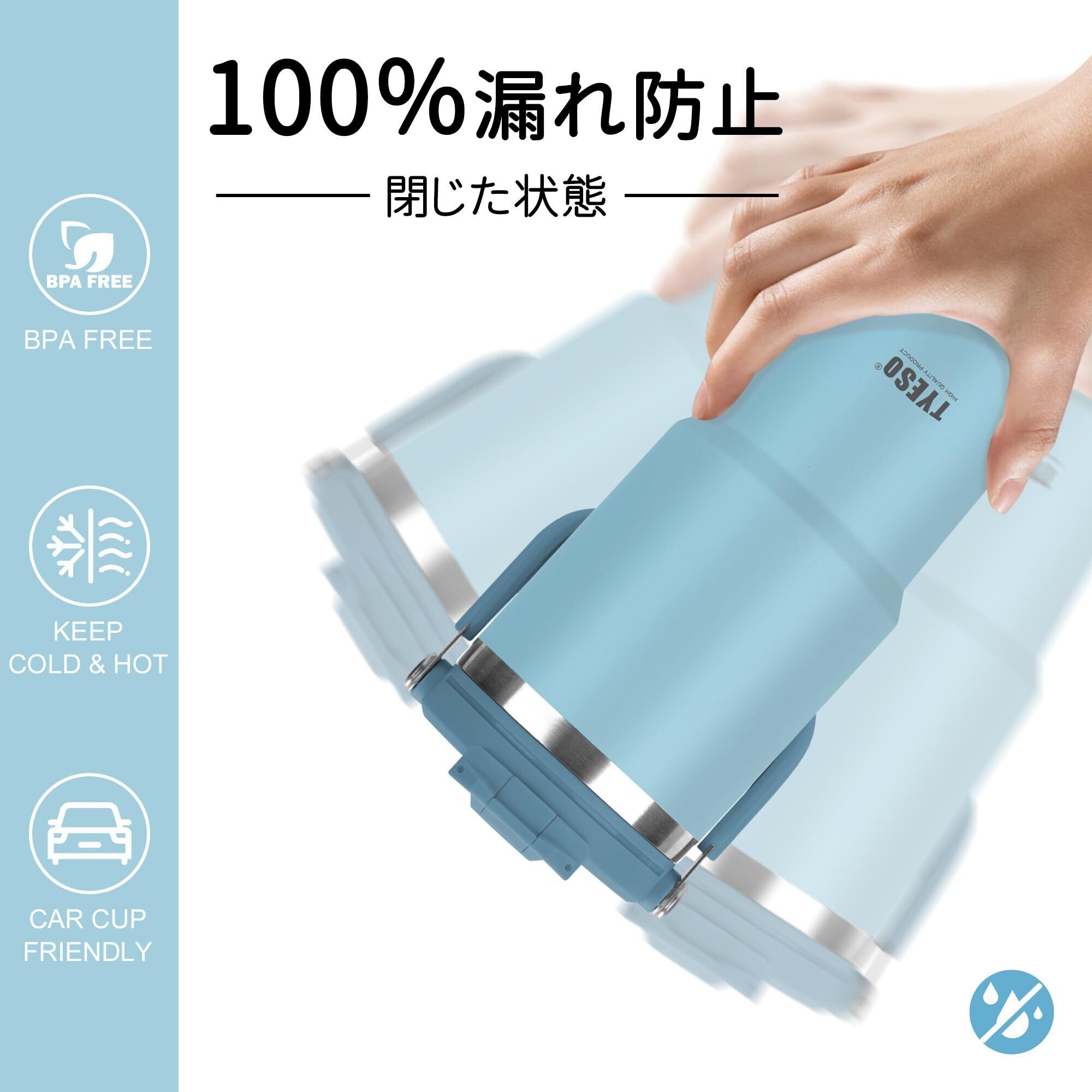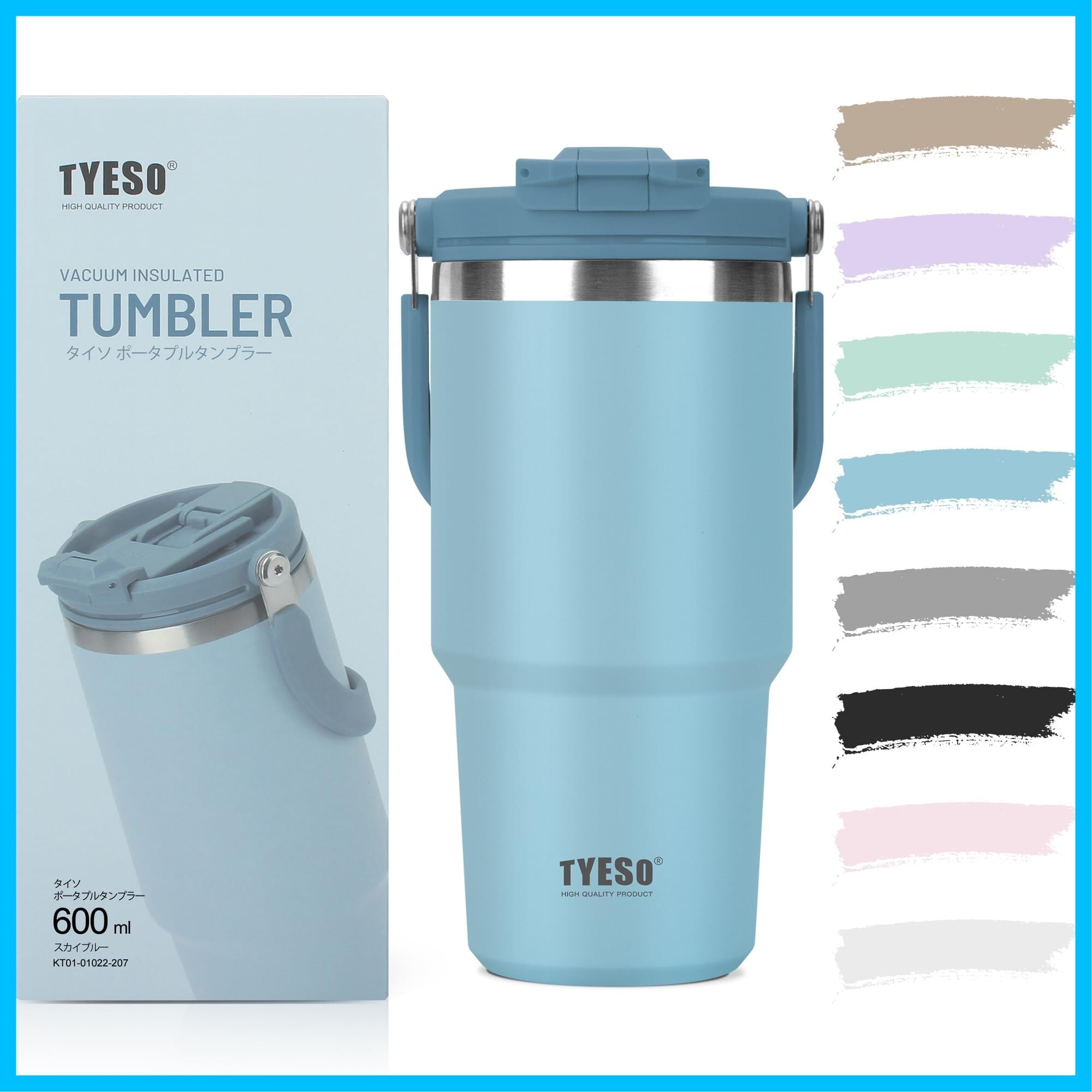 TYESO タンブラー ストロー付き 600ml 水筒 保冷保温 大容量 ステンレスボトル 蓋付き こぼれない ウォーターボトル 持ち運び 取っ手付 真空断熱 二重構造 広口 直飲み 漏れない アウトドア おしゃれ スカイブルー KT01-01022-207