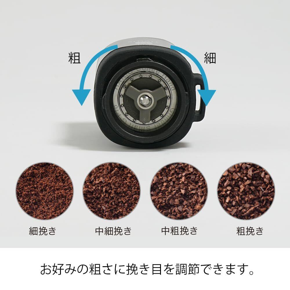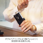 粒度の揃いやすいステンレス製の臼を搭載しています。 ダブルベアリングにより軸ブレしにくく、挽き心地が安定します。 ハンドルをバンド部分に収納できるコンパクトな設計で持ち運びに便利です。 粉受けには挽いた粉の量が一目でわかる目盛り付きです。