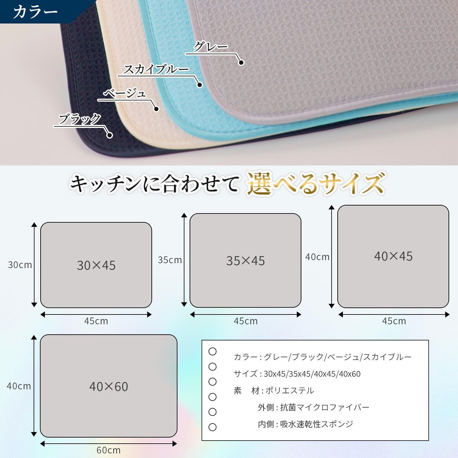水切りマット 抗菌 速乾吸水マット 30x45cm 食器乾燥マット 丸めて収納 キッチン マイクロファイバー シンク上 ラック 棚シート Sanleaves 水切り マット