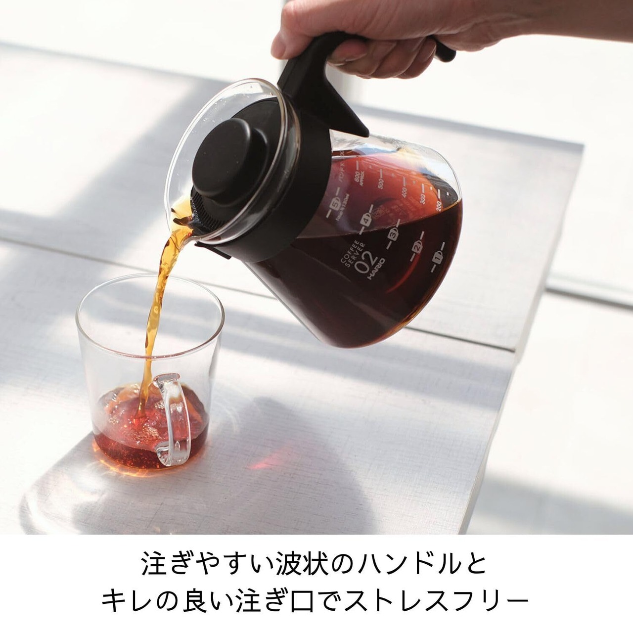 お好みに合わせて抽出できる目安目盛とカップ表示付きのコーヒーサーバー