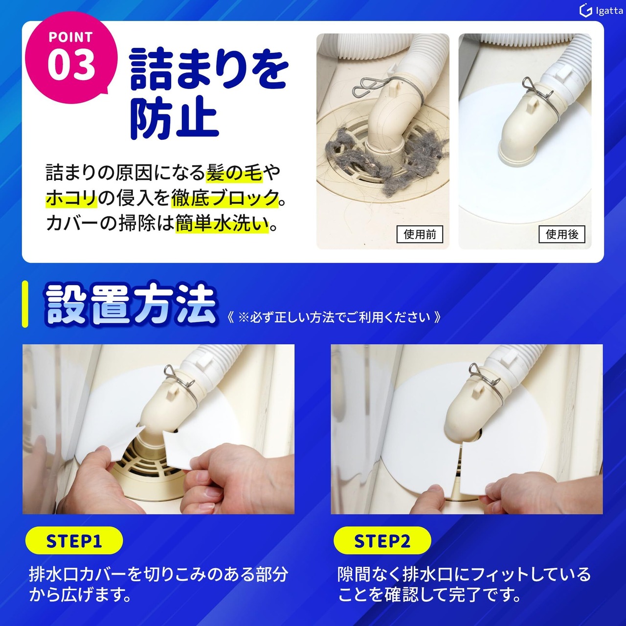 【詰まりを防止】洗濯機の排水口詰まりの原因となる、髪の毛やホコリが排水口に侵入することを防ぎます。設置するだけで、排水口周りのお掃除が簡単に。