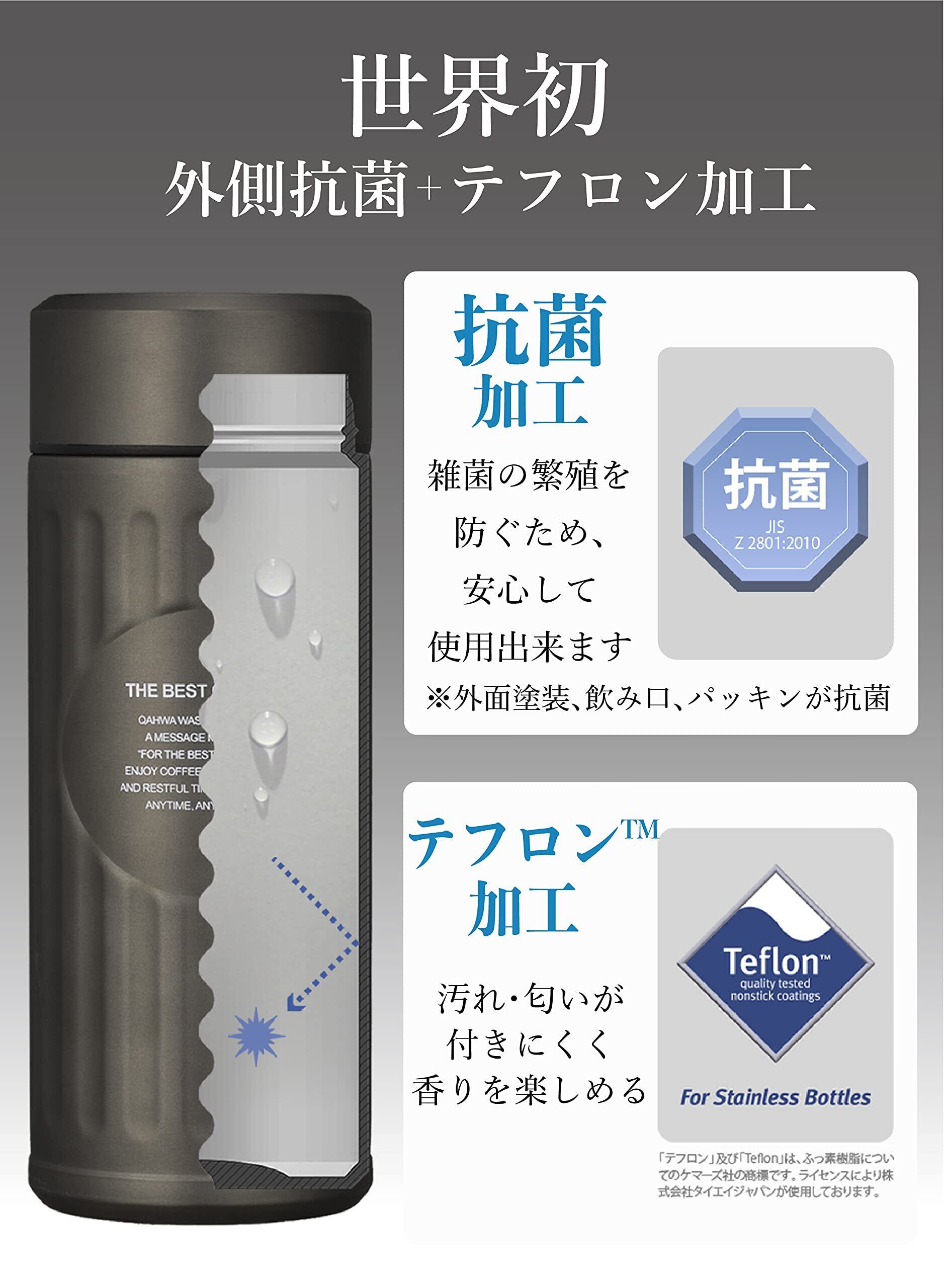 【Teflon加工】ボトル内面はテフロン加工を施し、汚れが付きにくく、落ちやすいので衛生的。飲み物の匂い移りなどがしにくく、コーヒー本来の味と香りをお楽しみ頂けます。