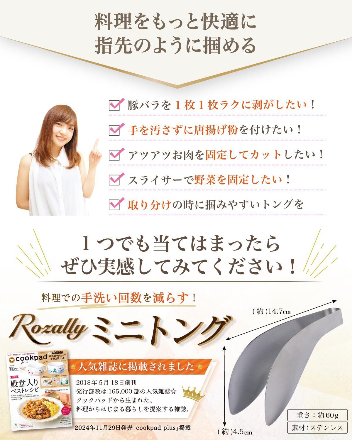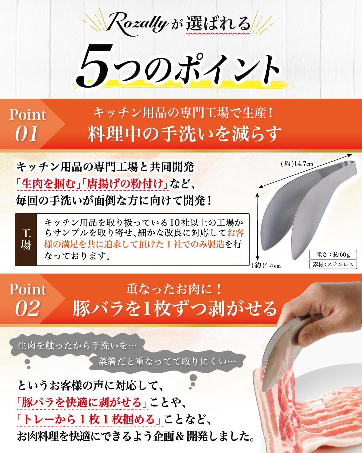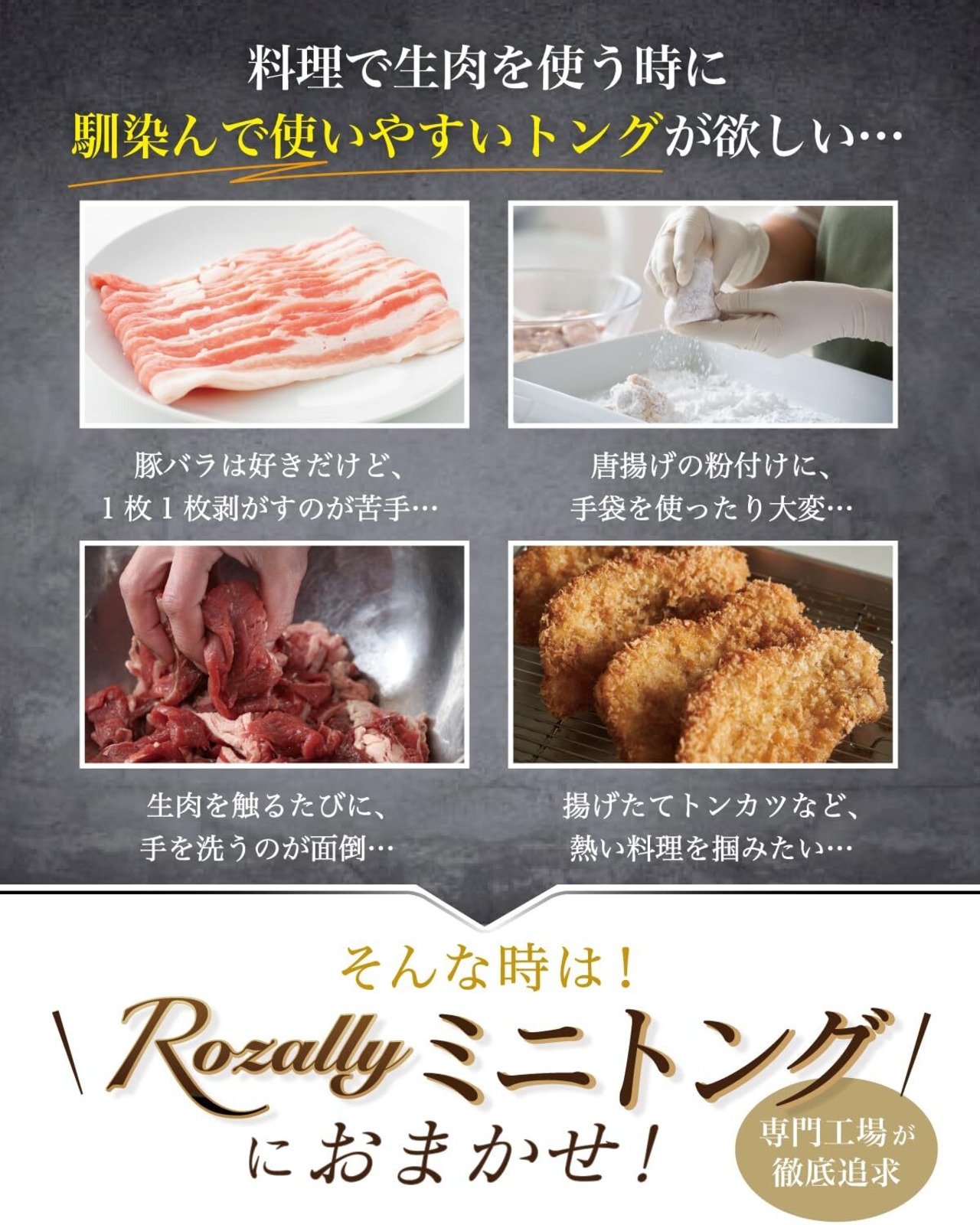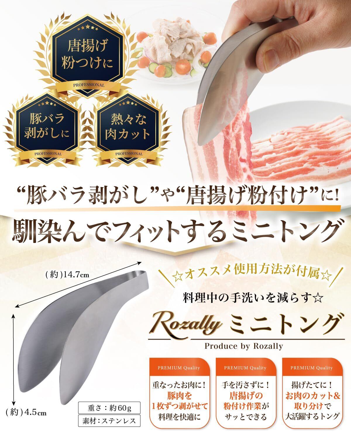 【キッチンで大活躍】 Rozally ミニトングがついに正式販売開始。 「豚バラ肉を1枚1枚剥がしたい」「唐揚げ粉を付ける時に手を汚したくない」という お客様に人気の ステンレス 素材の ゆび先 ようなフィット感の トング です。 「生肉を触る度に手を洗うのが面倒…」「小回りの効くトングが欲しい…」 そんなお客様の声から生まれた指先にフィットして小さく使いやすいミニトングです。
