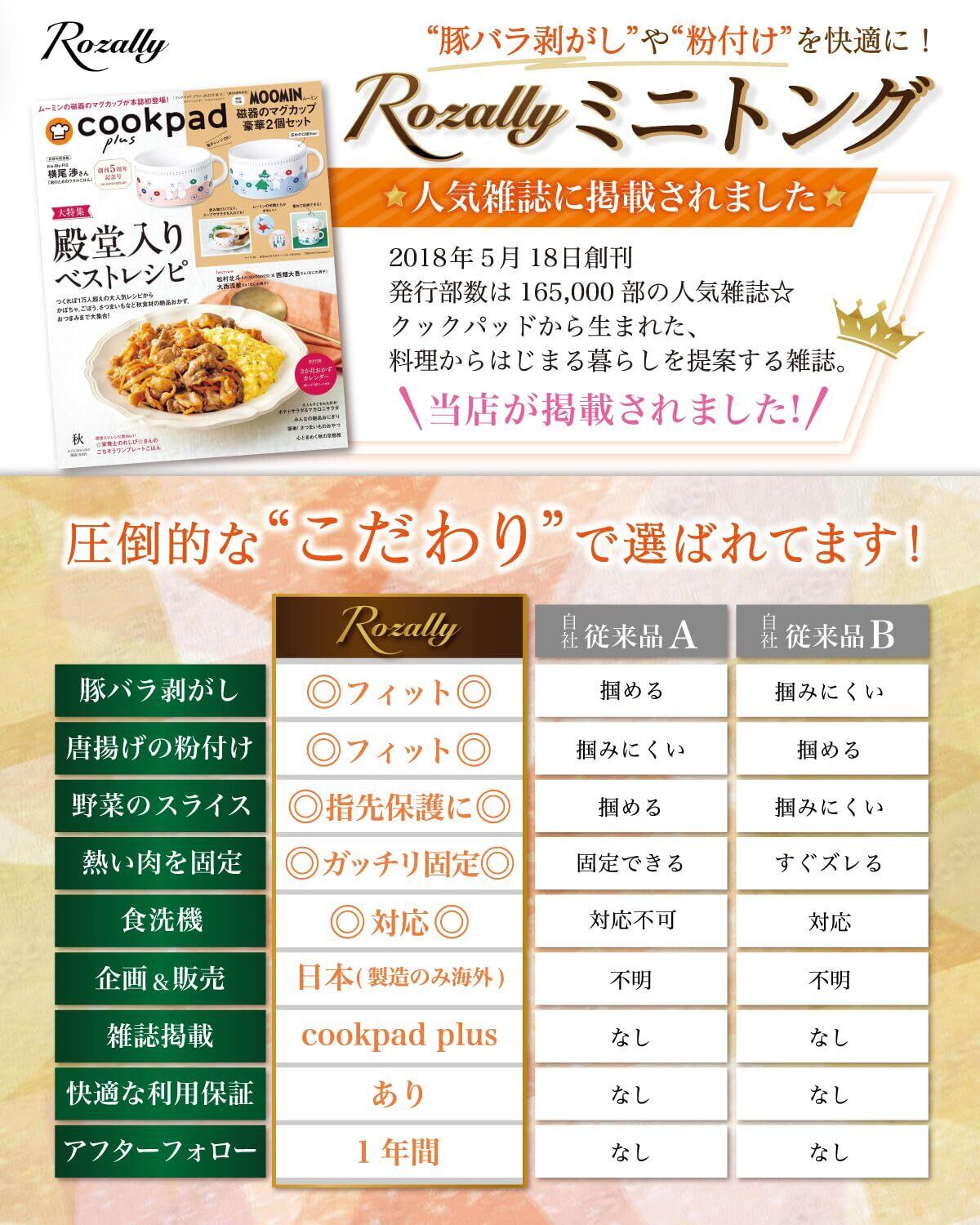 【こだわり】 様々なメーカーから キッチン 用品として ” 取り分けトング ”や” 盛り付けトング ”などステンレス製トング が日本製/中国製など様々に販売されていますが、 Rozallyの ミニ トング は”こだわり”が一味違います。 小型サイズ[ミニサイズ]の設計で指先のようにフィットして使え、 手を汚すことなく料理を行うことができます。 またミニトング本体は食洗機対応なので、”水洗い”もラクラクです。