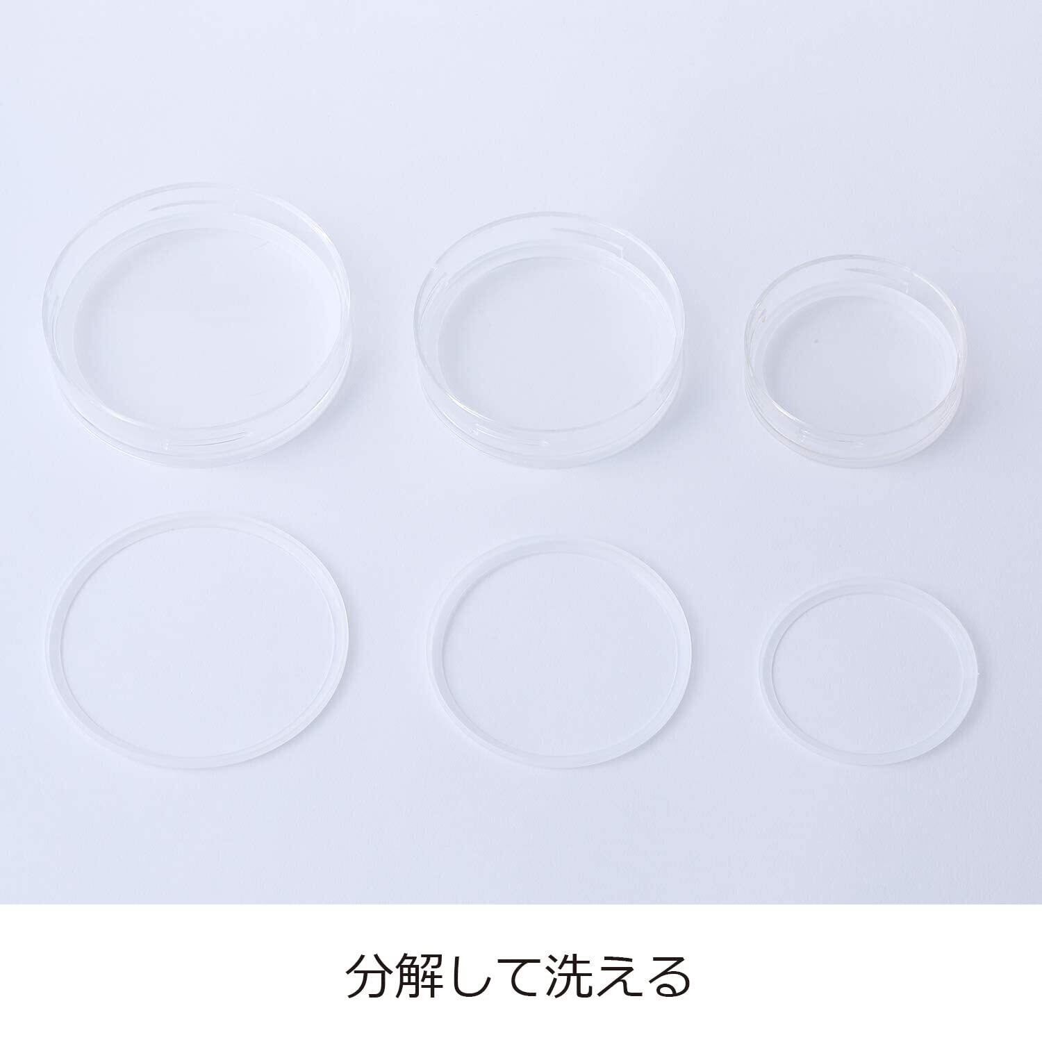 広口だから使いやすい! 洗いやすい! ○使いやすさを考えた広口設計。○完全透明で多彩に使いこなせるシンプルなデザイン。○机の上の細々したものをお片づけ。○アクセサリーや繊維小物など入れるものは何でもOK。○増えていく小物をすっきりまとめてくれます。商品サイズ(約):胴径84X高さ61mm容量:170ml本体:ソーダライムガラスフタ:メタクリル樹脂 耐熱温度(熱変形温度)70度パッキン:ポリエチレン樹脂(抗菌剤入り) 耐熱温度(熱変形温度)40度