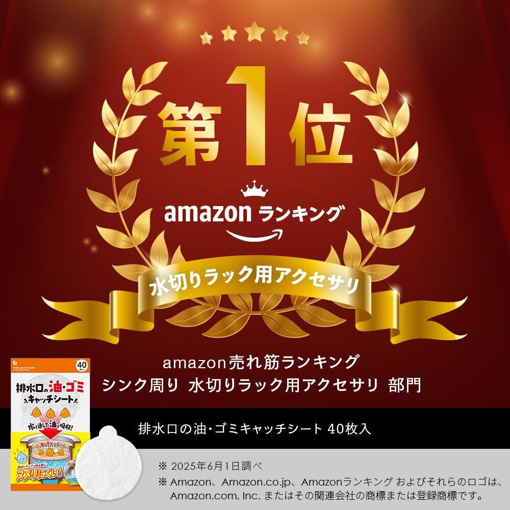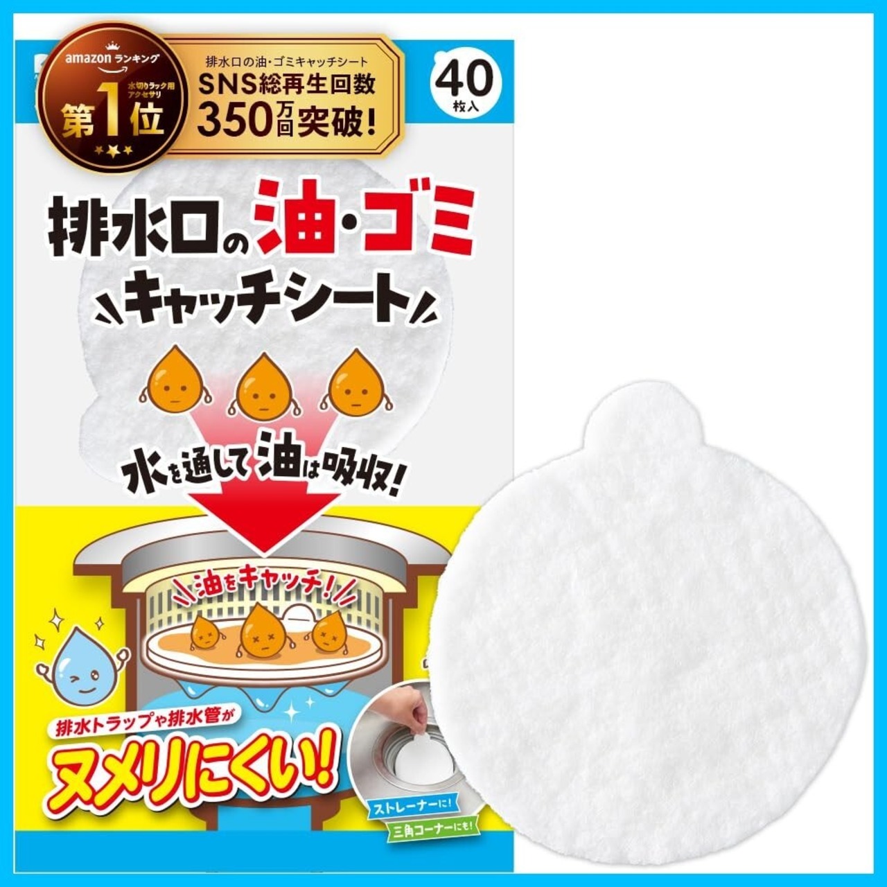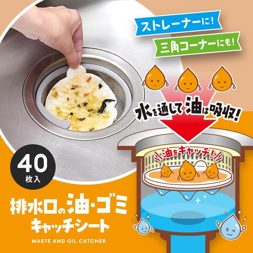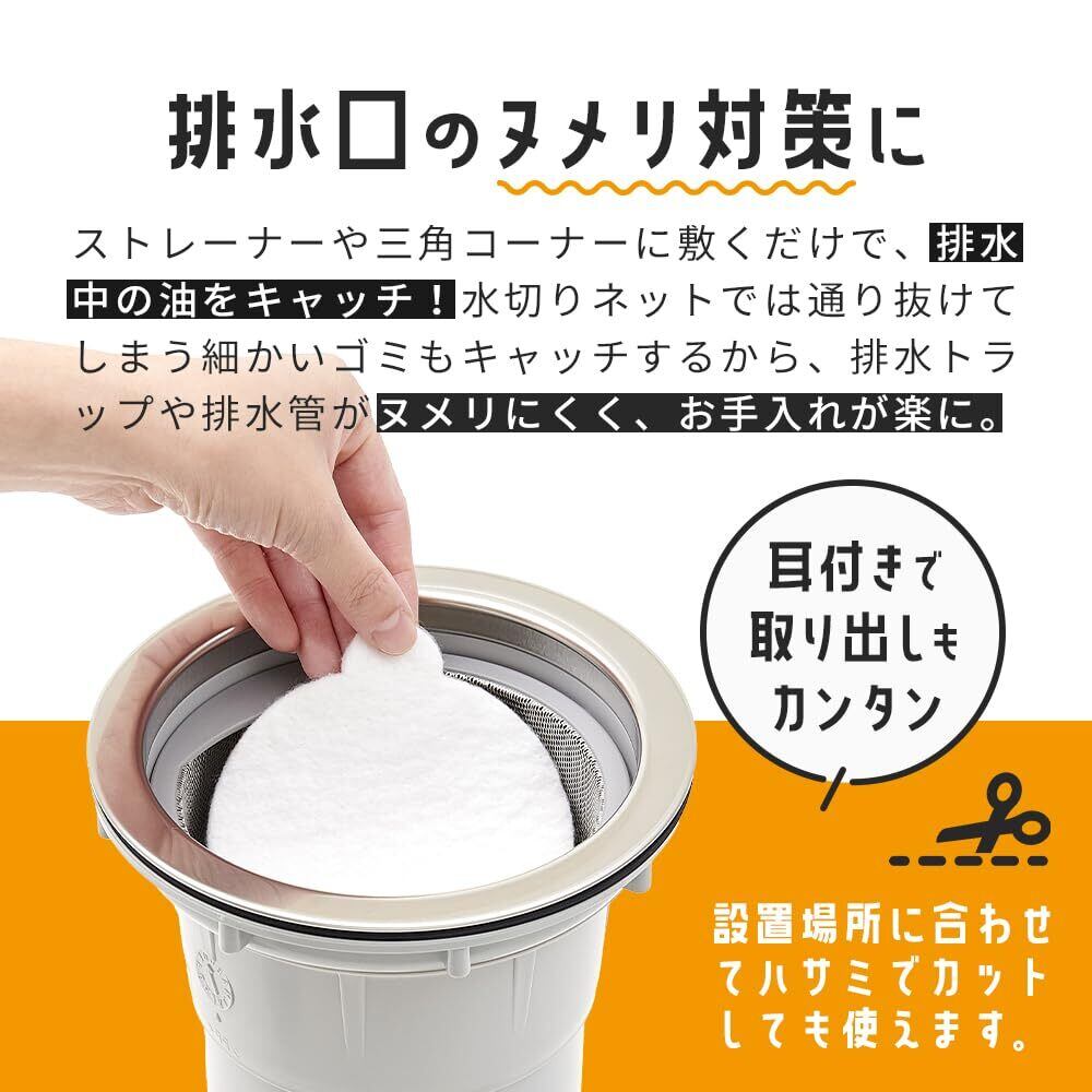 ストレーナーや三角コーナーの底に敷くだけで食べ物や食器に残った油、水切りネットでは取りきれない細かいゴミもキャッチ!シート1枚で約40gの油を吸収。水を通して、油はしっかり吸収します。排水トラップや排水管がヌメリにくく、お手入れが楽に。