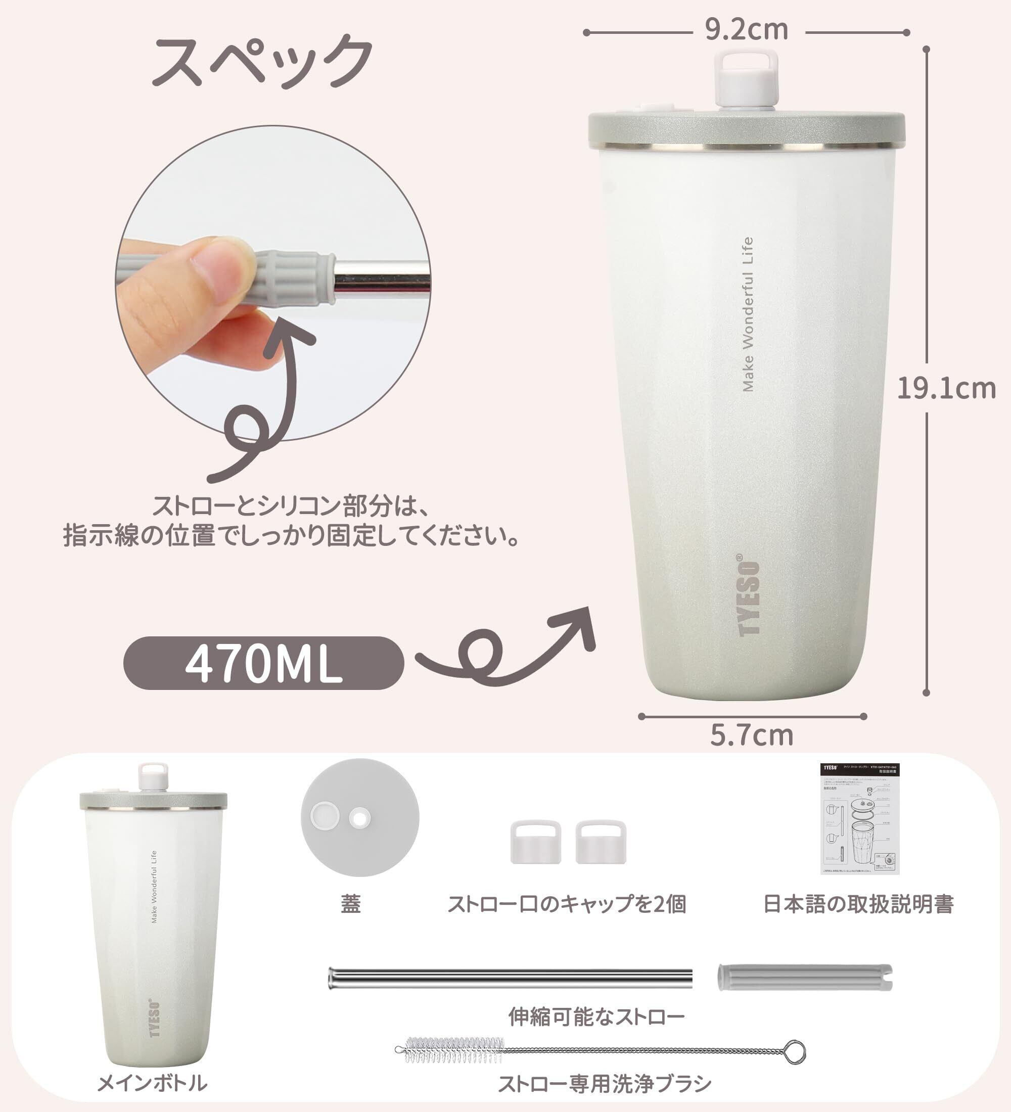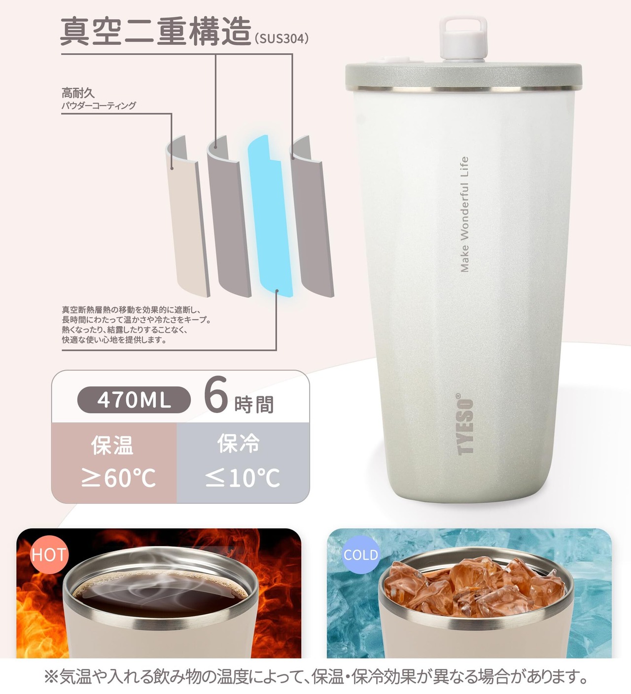 TYESO タンブラー ストロー付き 470ml ステンレス 蓋付き 真空断熱 保温 保冷 アウトドア 持ち運び便利 直飲み 漏れない 大容量 多色 トラベル 2025年アップグレード版