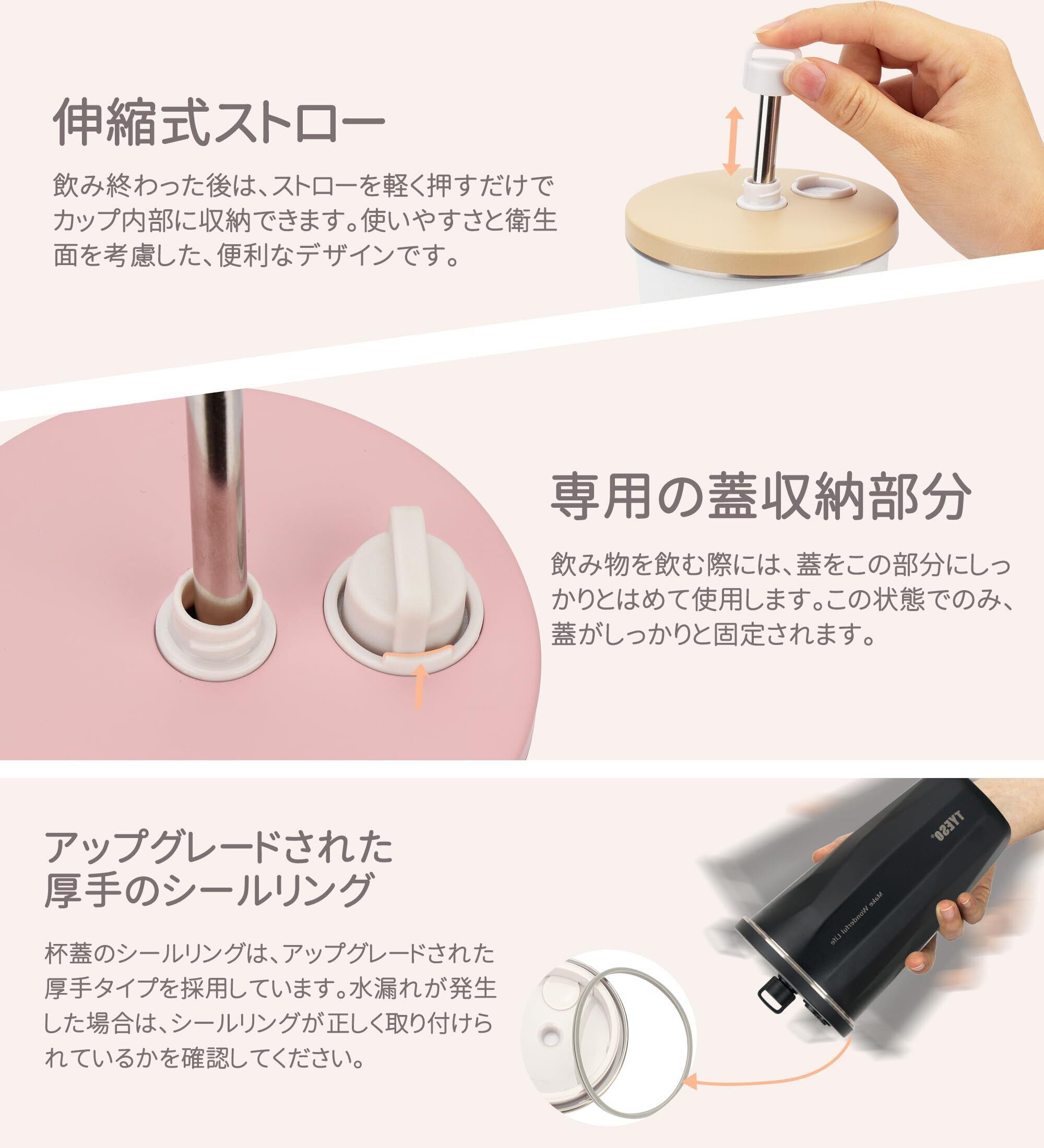 伸縮ストローと簡単清掃:このタンブラーには、使わないときに吸管を押し込んで収納できる伸縮式ストローが搭載されています。ストローとフタは取り外して洗浄可能で、清潔に保てます。吸管口には2つのキャップ(1つ予備キャップ)が付いており、漏れ防止ができます。さらに、専用の吸管ブラシが付属しており、隅々までしっかり清掃できます。日常使いやオフィス、アウトドアに便利なタンブラーです。