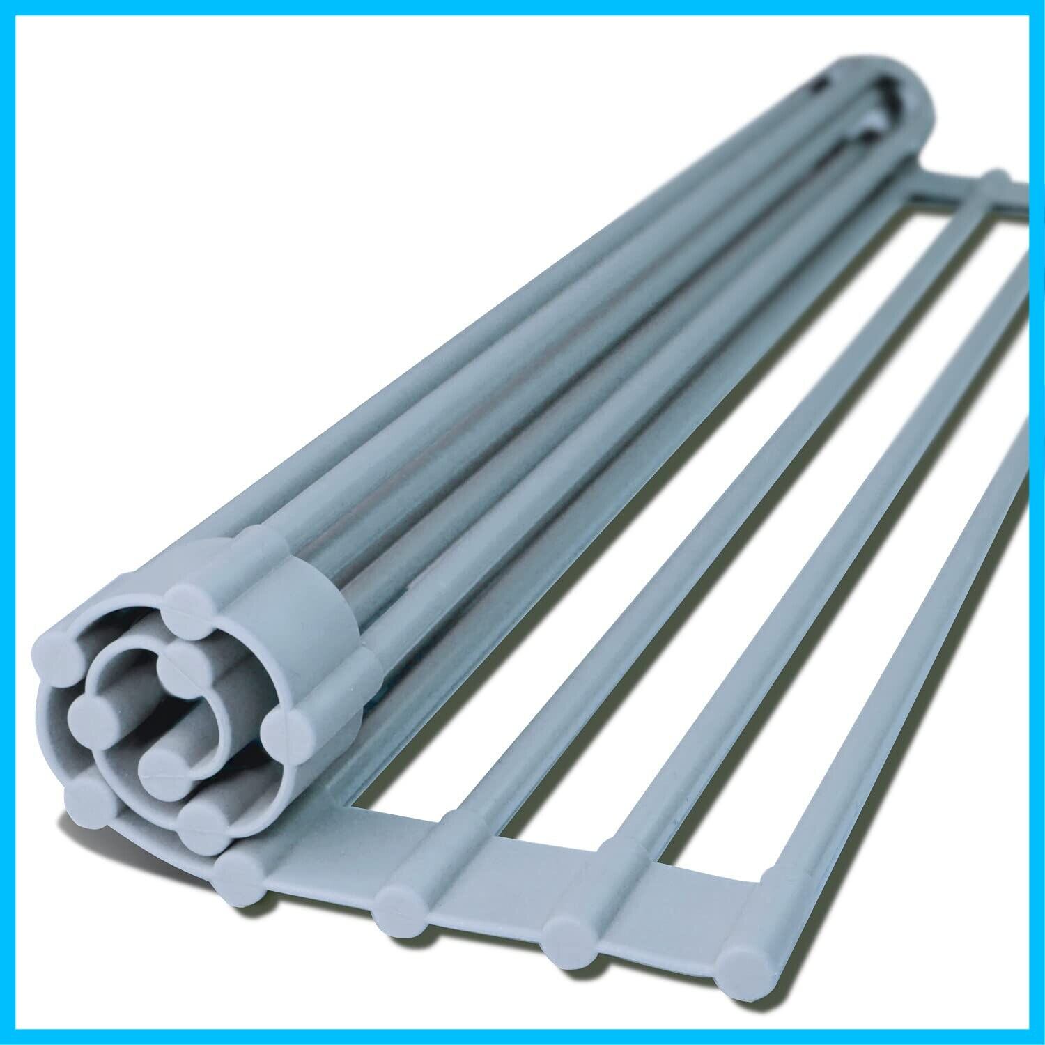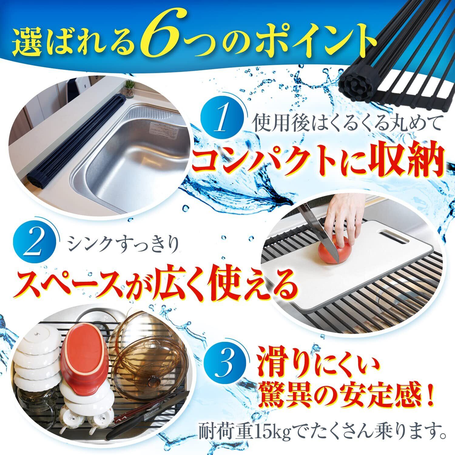 【基本仕様】折り畳み式の水切りラックです。小さく丸めてたためる設計でサイズをご自宅のシンクの大きさに合わせられるので、キッチン周りのスペースを有効活用できます。耐荷重15kg, 耐熱250度の特別仕様のため、2人分の皿・カトラリーなど大容量のものを置いても安定・安心です。さらに棒と棒の間を切ることができるので、お好きな幅に調節できます。※シンクの内径が~38cmまで対応可能※サイズにつきまして、シリコン素材なので若干の個体差(±0.2cm)が生じます。ご了承ください。