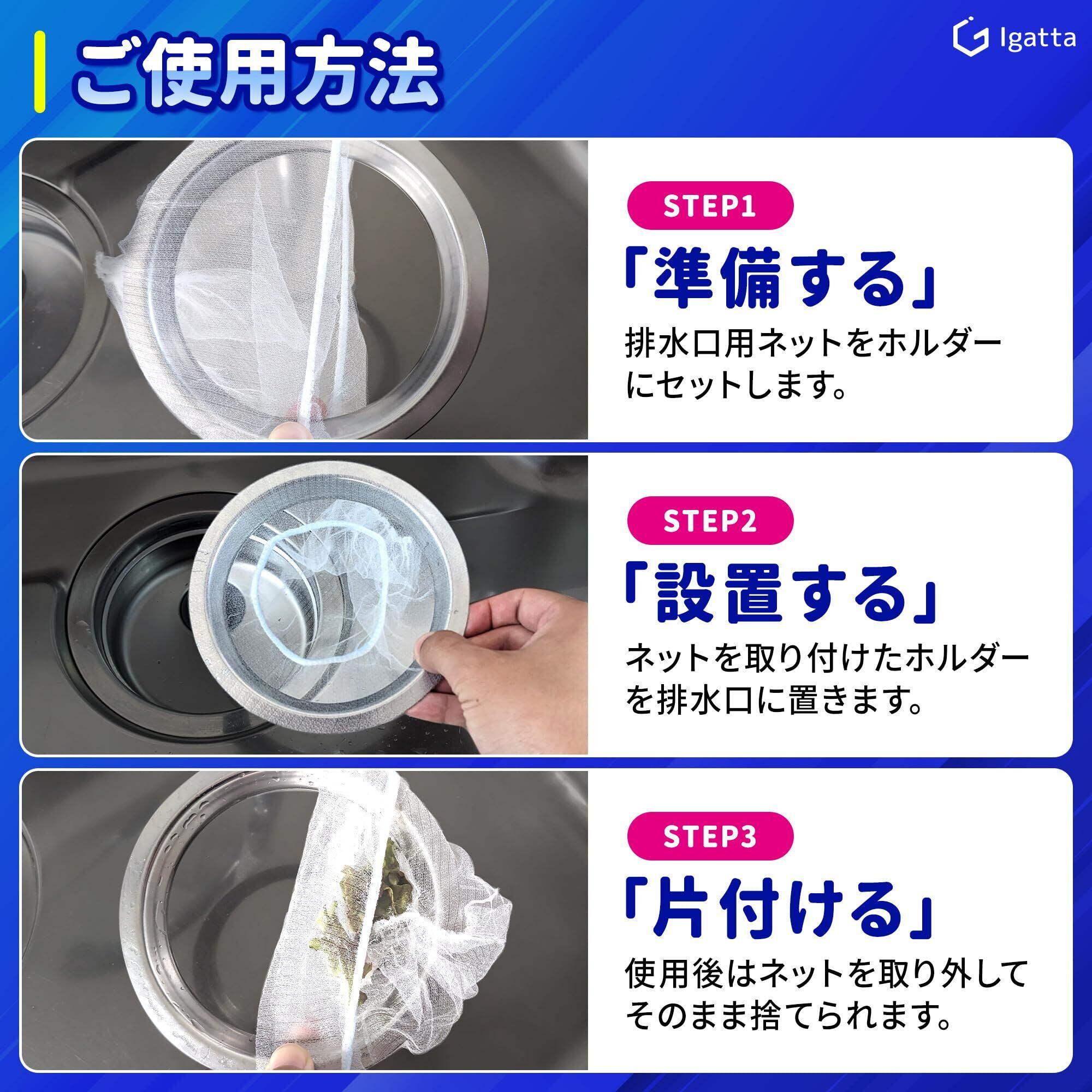 【ご使用方法】《STEP1》排水口用ネット(別売り)をホルダーにセットします。《STEP2》ネットを取り付けたホルダーを排水口に置きます。《STEP3》使用後はネットを取り外してそのまま捨てられます。