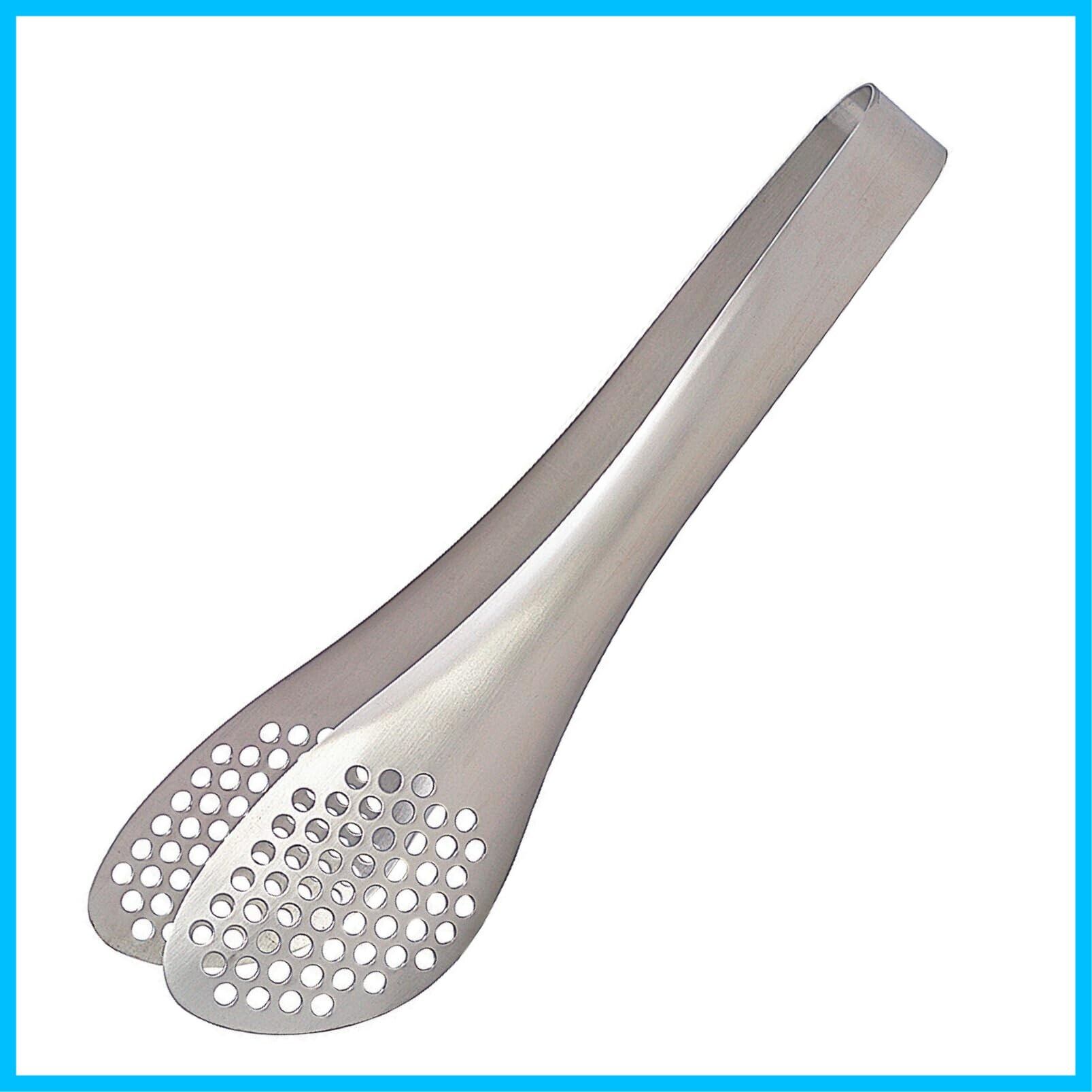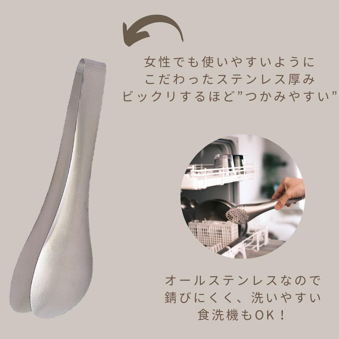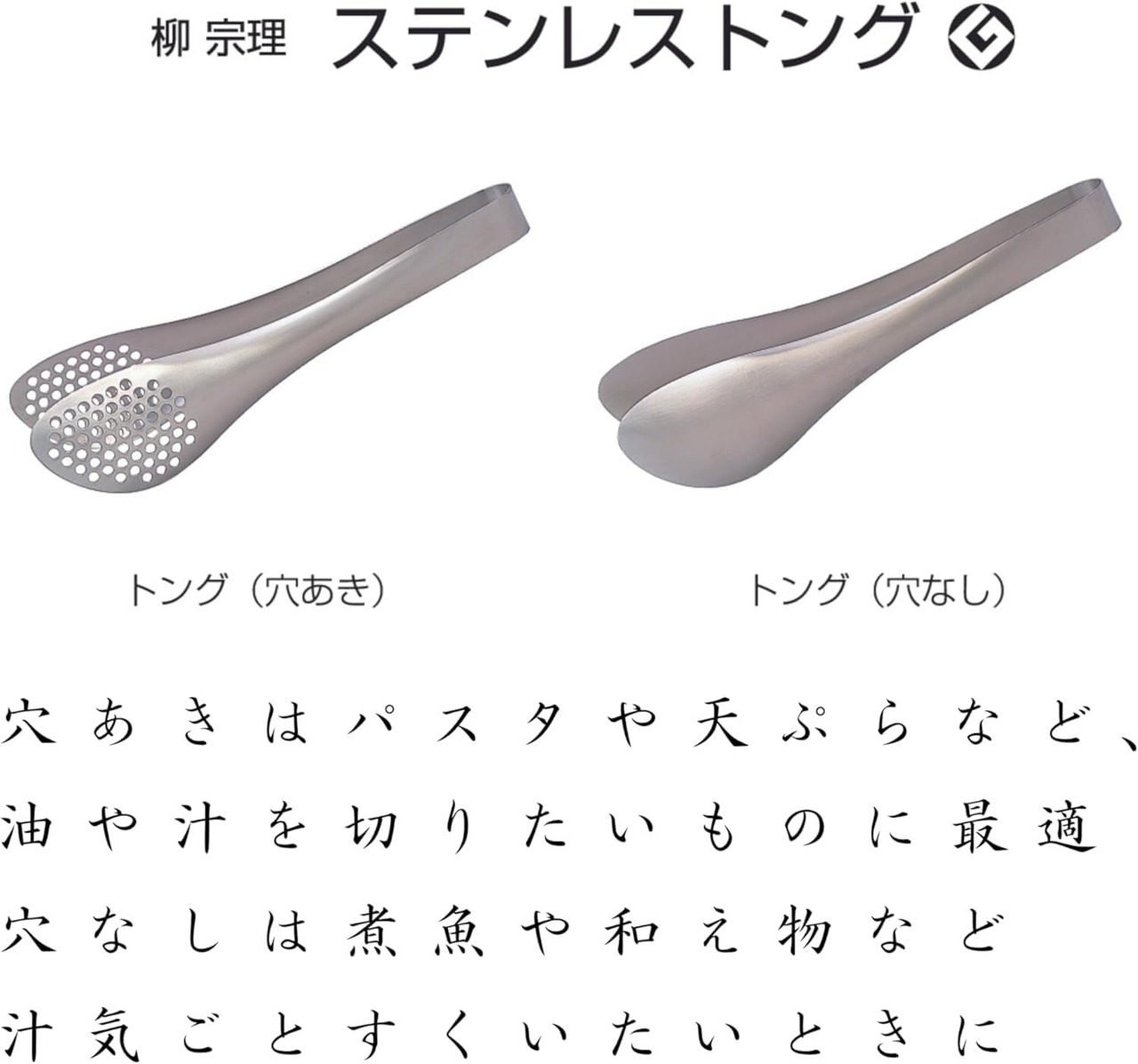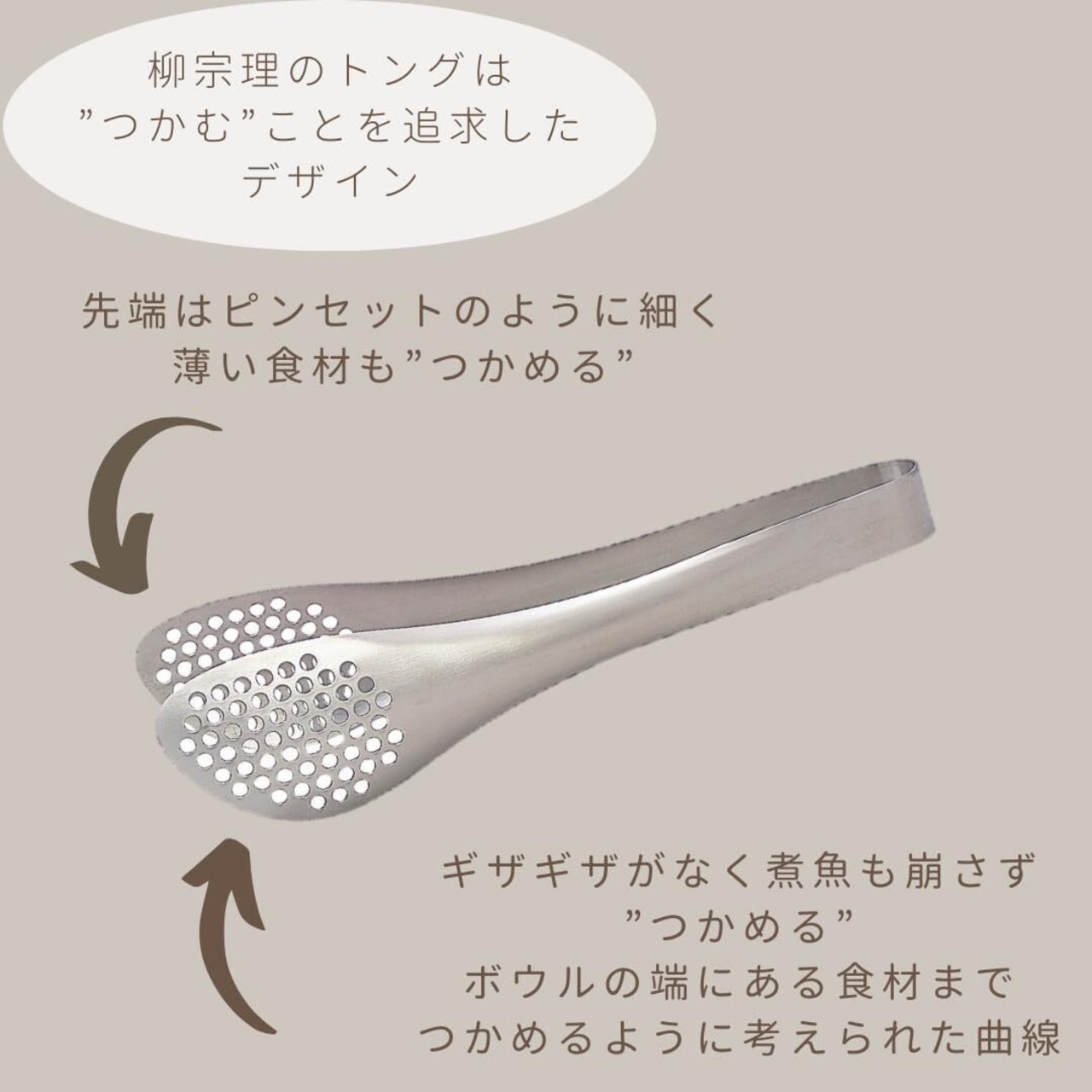 ●こちらはステンレス製の穴あきトング。普通のトングとして使えるのに加え、水分や油分が多いものを扱うときには抜群の使いやすさを発揮する。先端部分がギザギザになっている一般的なトングとは一線を画す、柔らかい丸みを帯びたフォルムは柳宗理ならでは。扱いやすいのはもちろんだが、何よりその美しさにほれぼれする。余計な継ぎ目などがない一体成形もポイント。(櫻田もんがい)