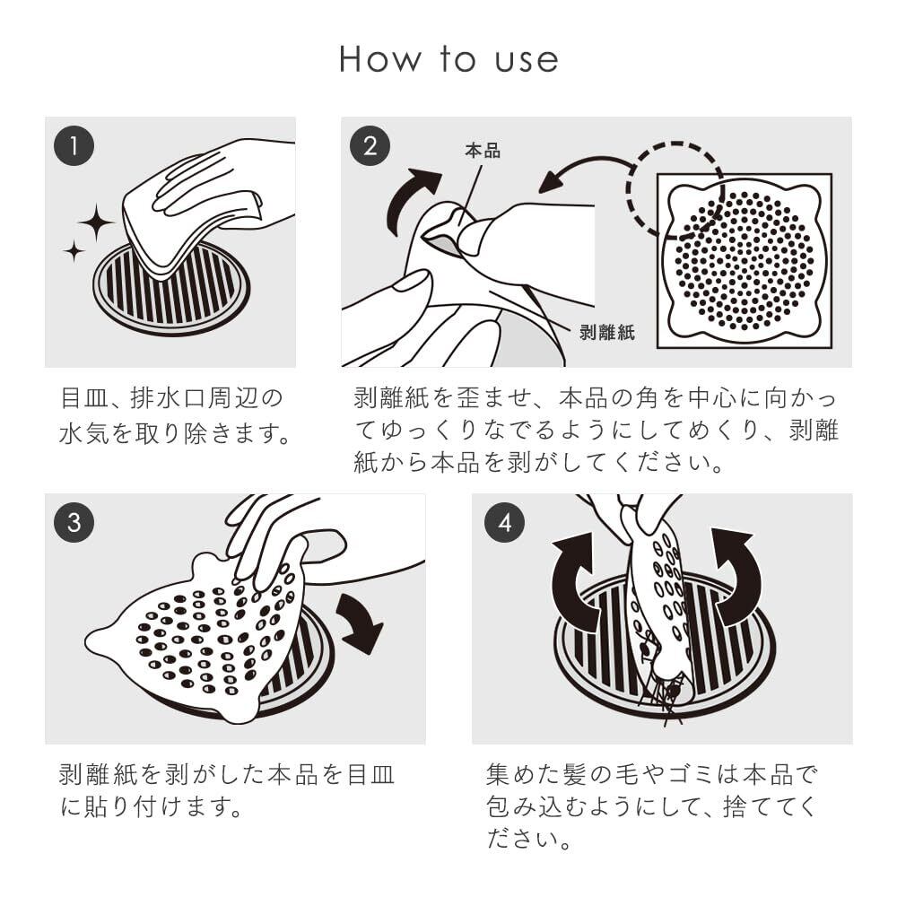 【使用方法】①目皿、排水口周辺の水気をタオルなどで完全に取り除いてください。②剥離紙を歪ませ、本品の角を中心に向かってゆっくりなでるようにしてめくり、剥離紙から本品を剥がしてください。③剥離紙を剥がした本品を目皿に貼り付けます。④集めた髪の毛やゴミは本品で包み込むようにして、捨ててください。