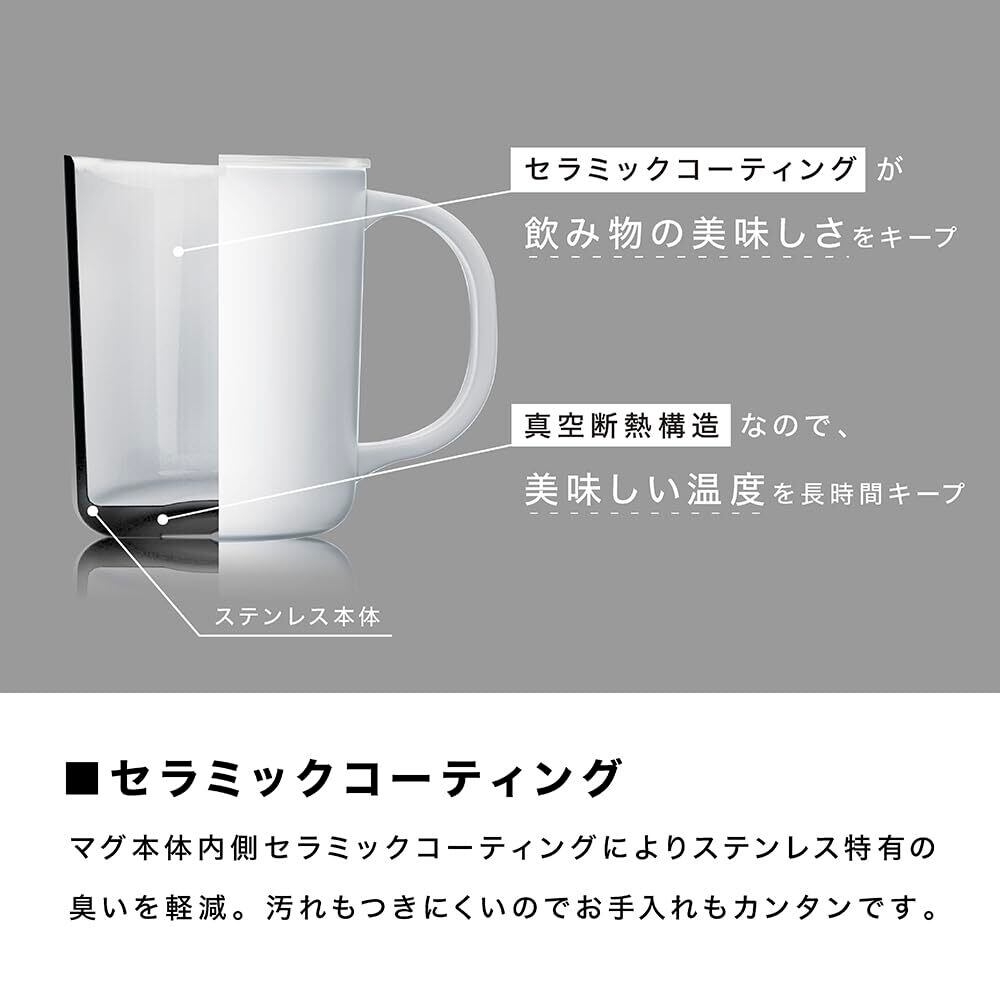 ●淹れたてのコーヒーのおいしさが続く、セラミックコーティングシリーズ。●マグ、ポットの内側にはセラミックコーティングを施しています。●ステンレス製特有の金属臭がしにくいため淹れたてのコーヒーのおいしさを長くお愉しみいただけます。●汚れがつきにくく、お手入れも簡単です。●本体はステンレス製真空断熱構造のため、おいしい温度をキープします。