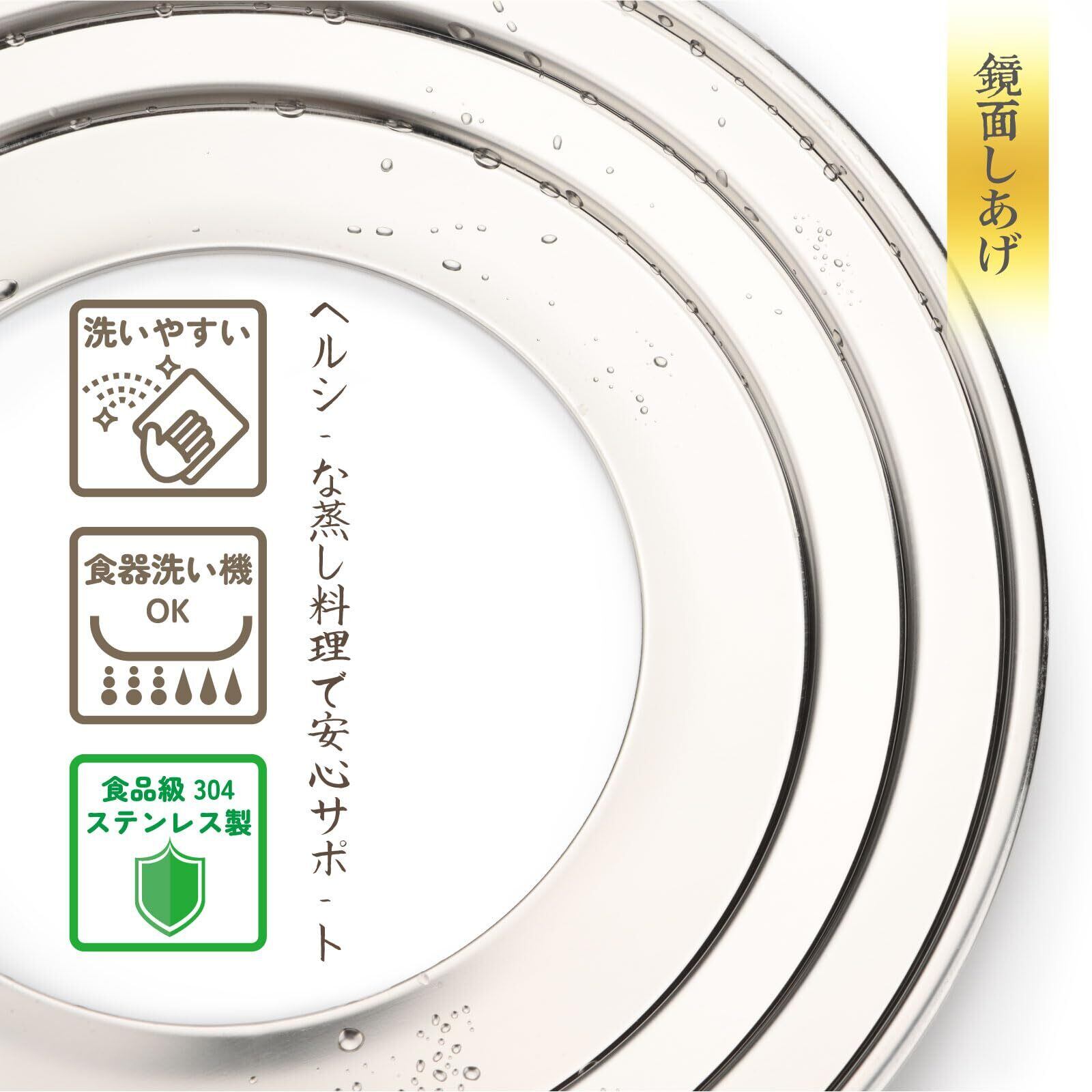 【適用サイズ】直径13.5cm~25cmの鍋と、15cm/18cm/21cm/24cmの蒸籠蒸し器に対応。異なるメーカーの製品間でもぴったりフィットし、蒸し料理の準備がスムーズに。