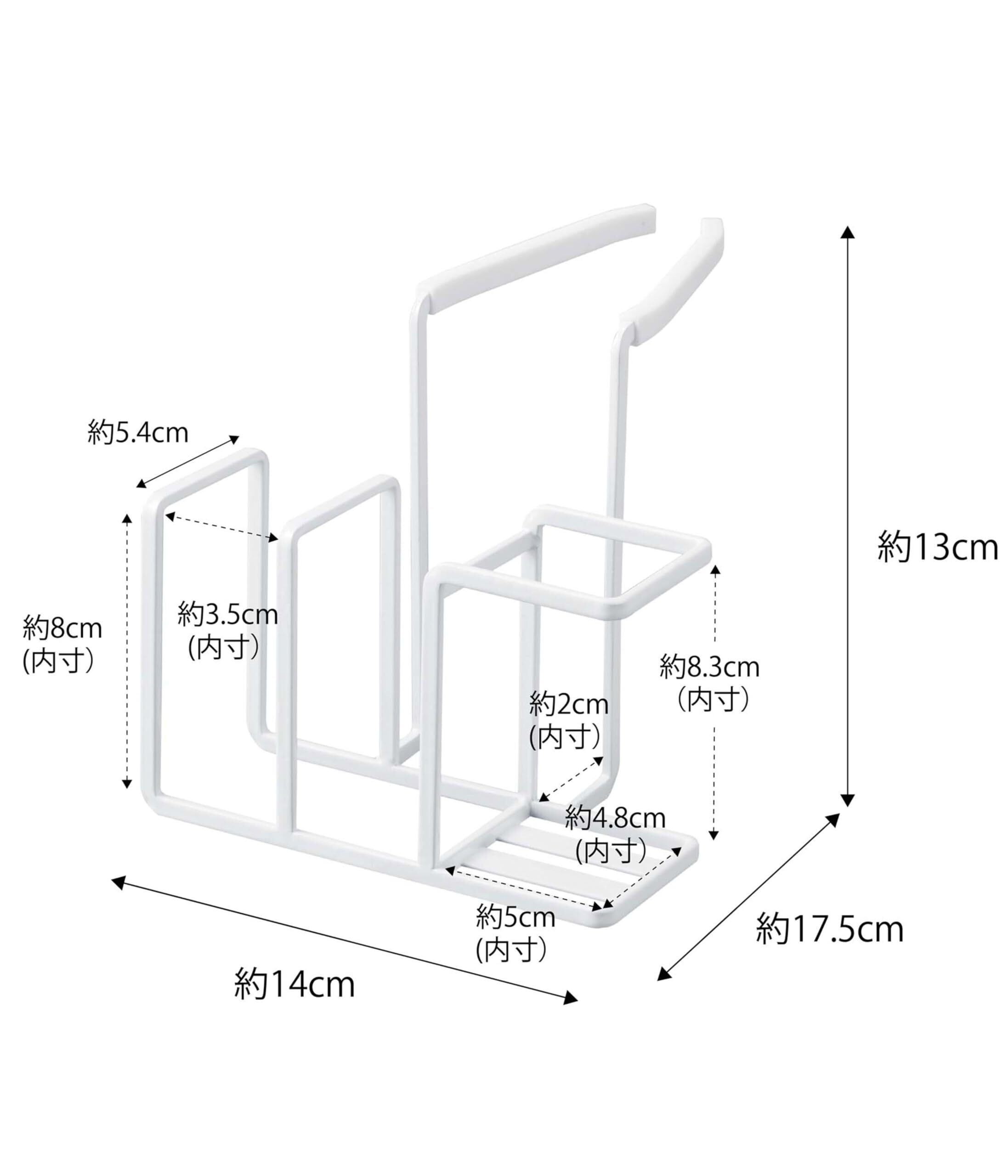 サイズ:本体 / 約 幅14.0 × 高さ13.0 × 奥行17.5 (cm) 内寸 / [スポンジ収納部(1つあたり)] 約 幅3.5 × 高さ8.0 × 奥行5.4 (cm) ボトルブラシ収納部:約 幅5.0 × 高さ8.3 × 奥行「4.8 (cm)