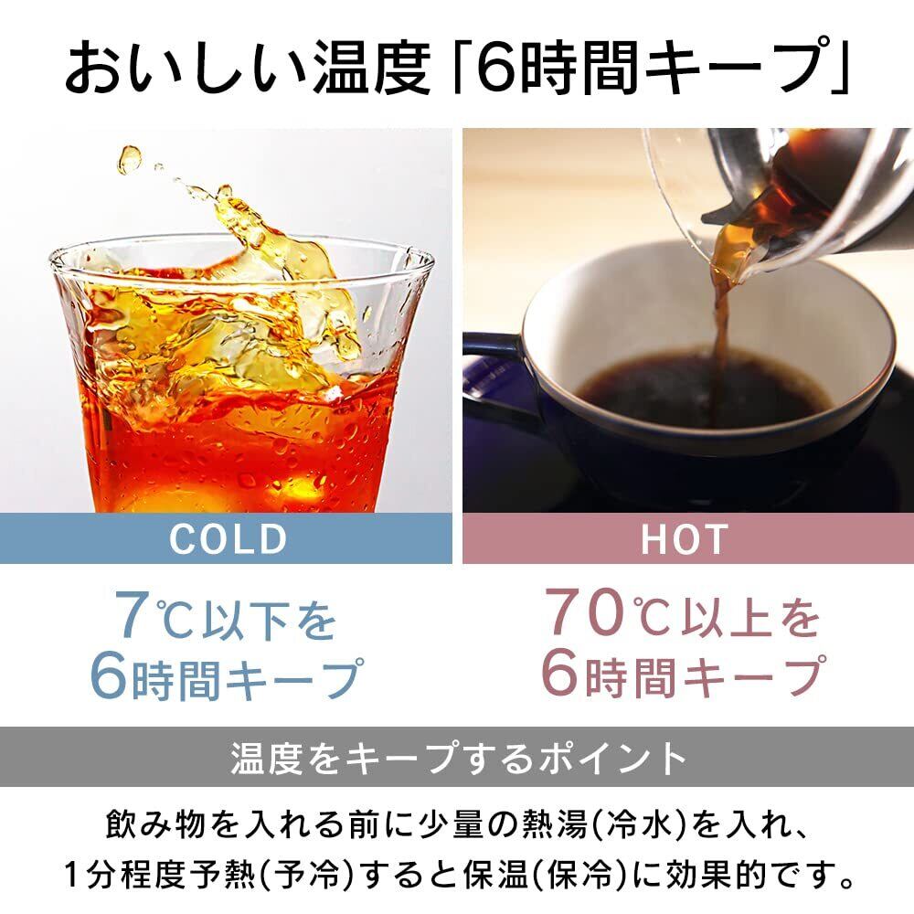 ※1 保温効力 室温20±2℃において、製品のせん下端まで熱湯を満たし、縦置きにした状態で、湯温が95±1℃のときから6時間放置した場合におけるその湯の温度のことです。 ※2 保冷効力 室温20±2℃において、製品のせん下端まで冷水を満たし、縦置きにした状態で、水温が4±1℃のときから6時間放置した場合におけるその水の温度のことです。