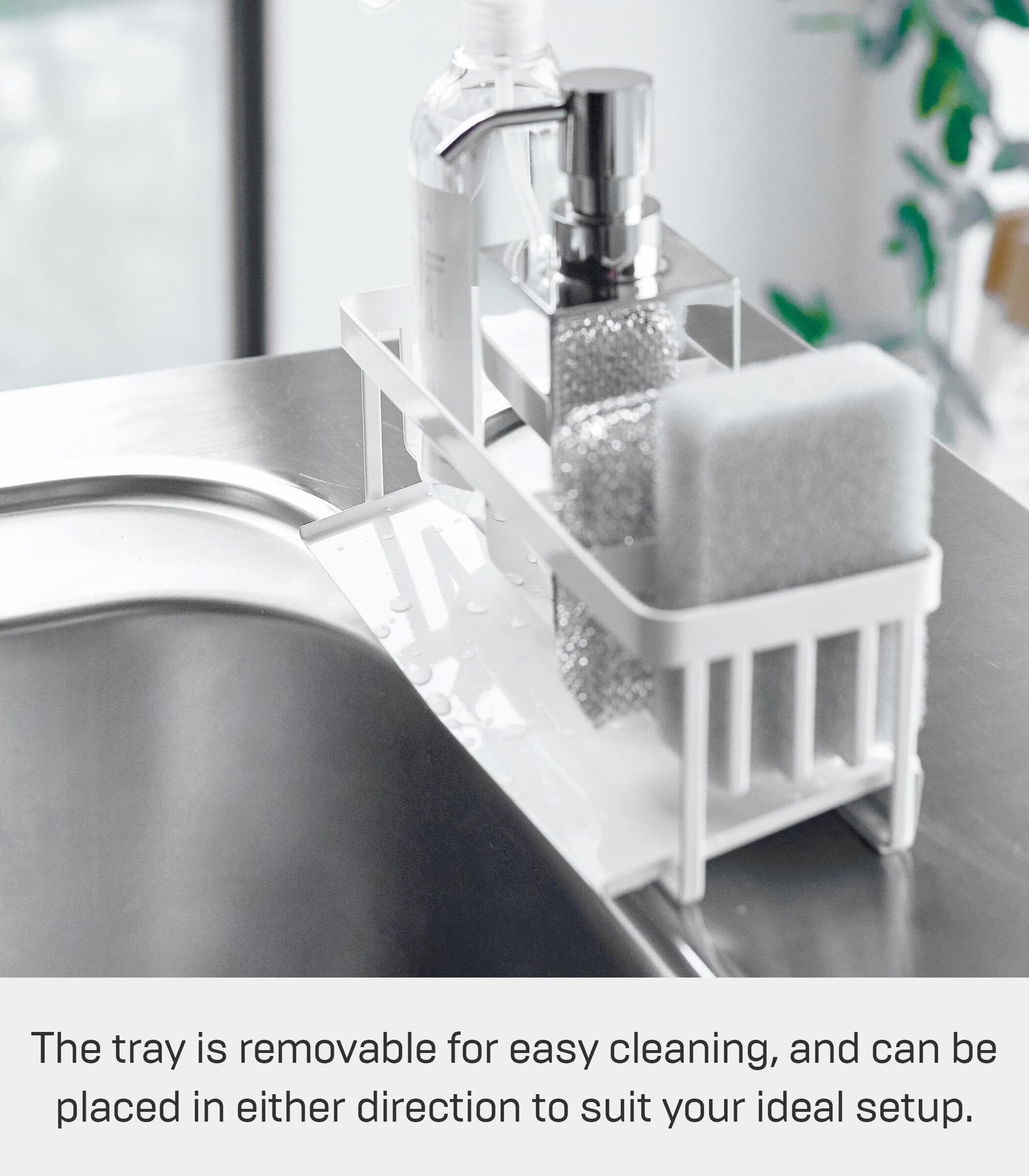 トレーが前と後ろどちらからも取り付けできるのでスポンジホルダーとボトルホルダーを左右お好きな位置に設置できます。
