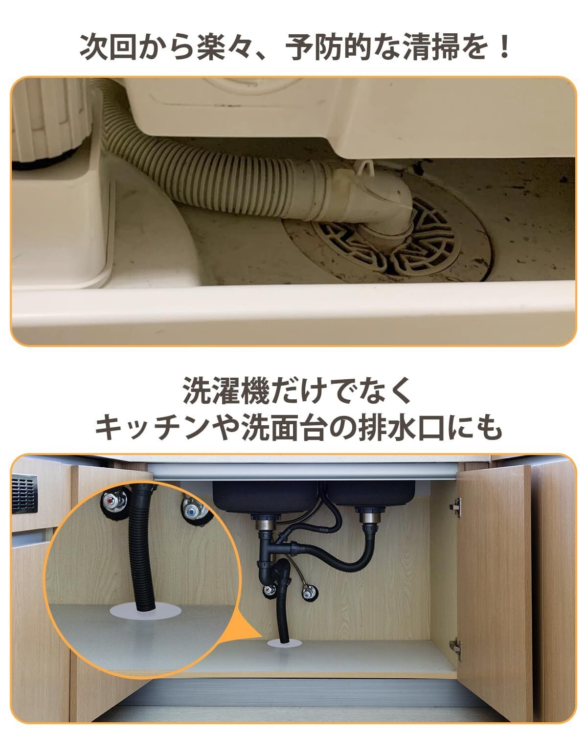 【自由にカットできて幅広く対応】排水管サイズに合わせて自由にカット可能。洗濯機排水口はもちろん、洗濯パン、キッチン、洗面所、浴室などにも使用できます。