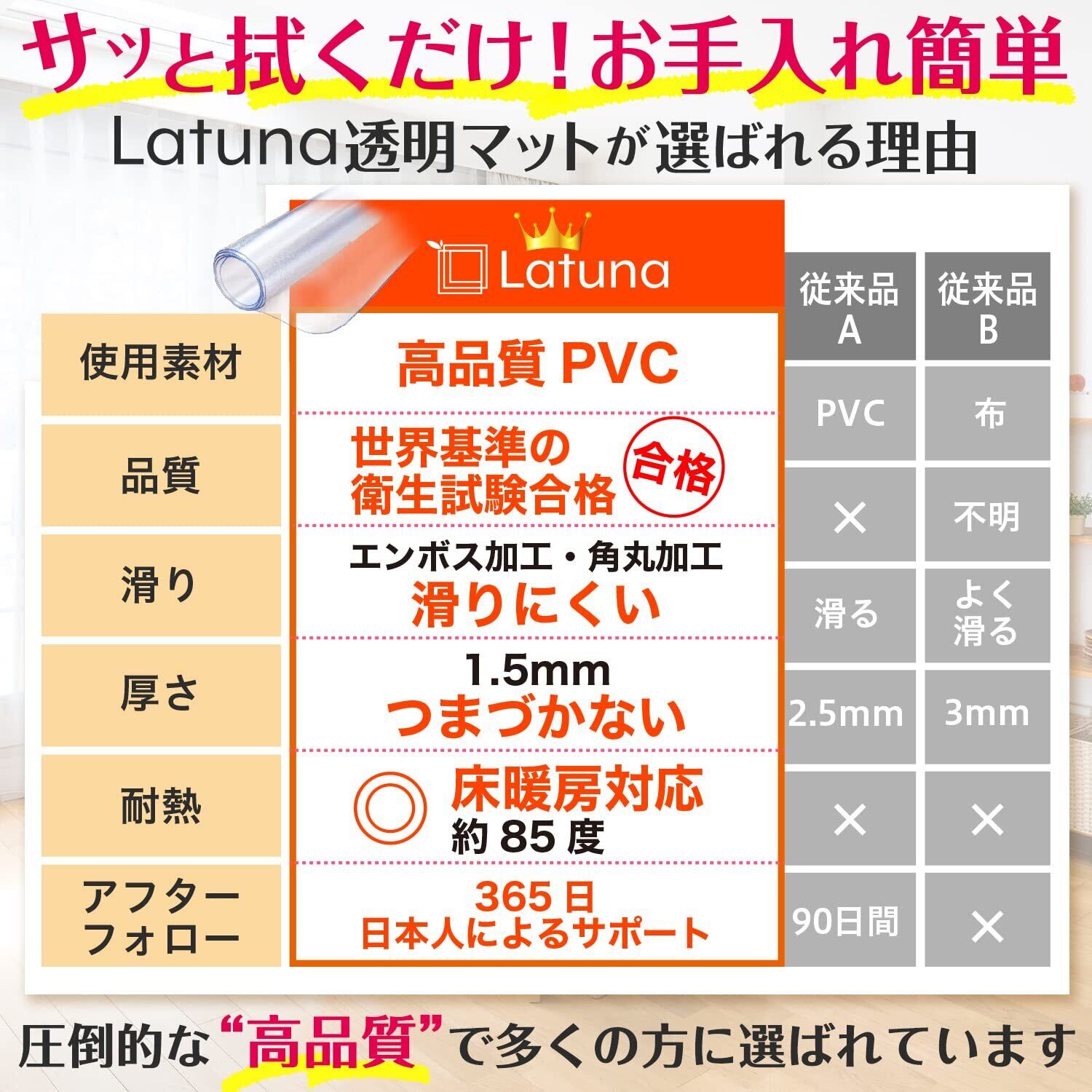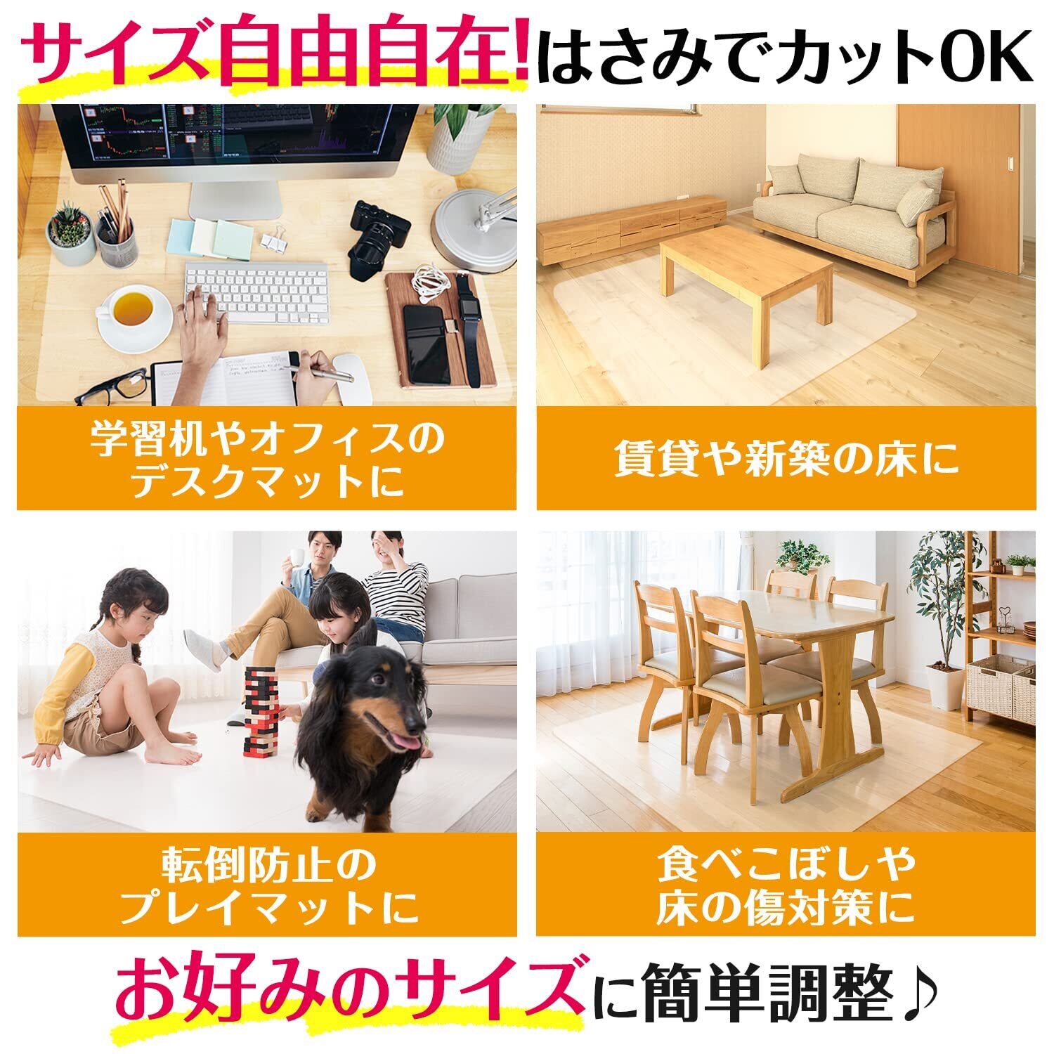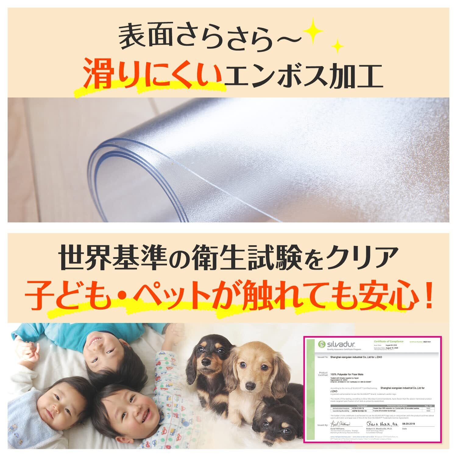 【傷つきにくいPVC素材】 布では落ちない液体の汚れも、サッと一拭きすることで落とすことができます。また、厚さが1.5mmと段差を気にせずお使いいただけます。透明なので、景観を阻害せずにインテリアにもしっかり馴染みます。