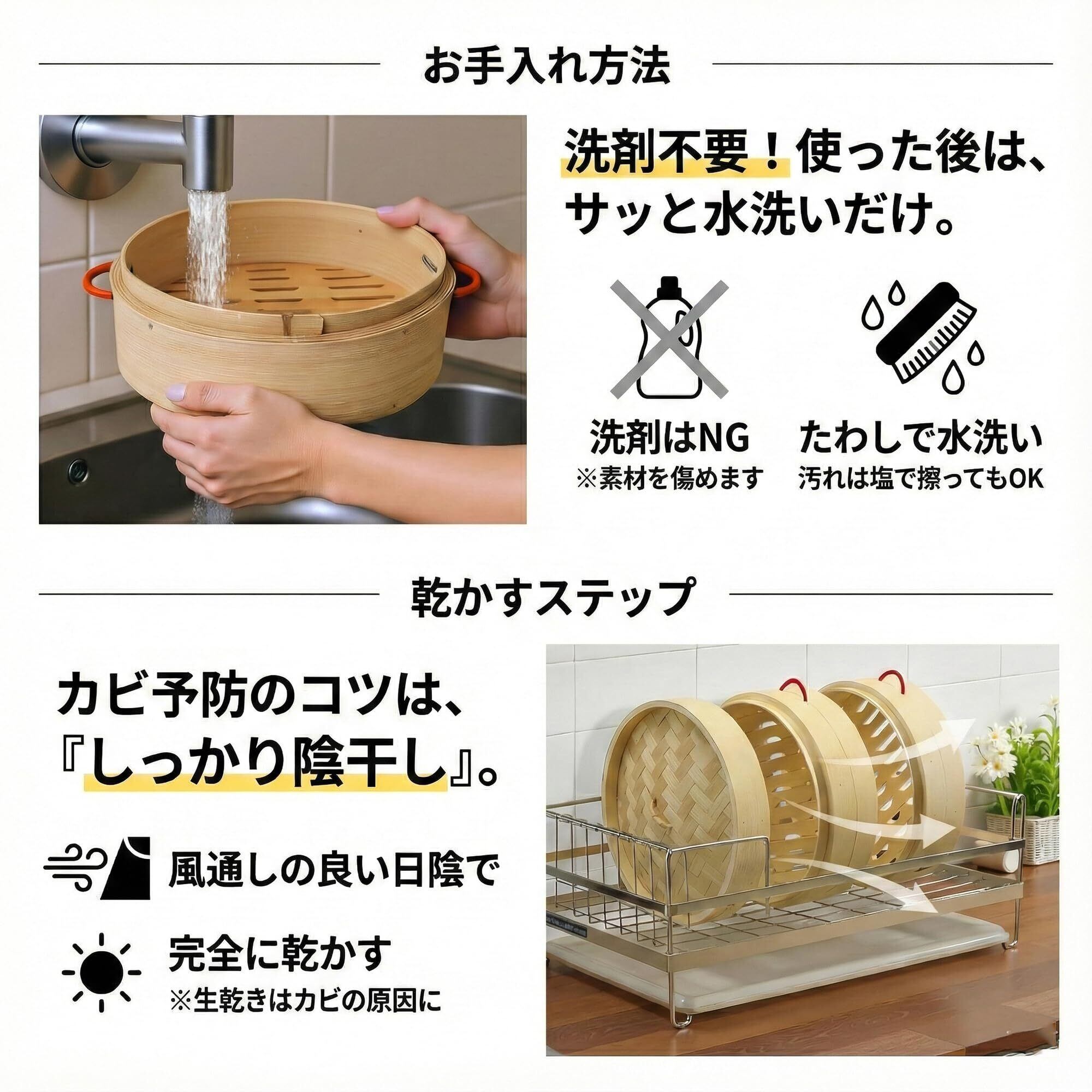 【天然竹でふっくら蒸し上げ】天然竹を使用し、熱が均一に伝わりやすく、ふっくら仕上がります。竹のやさしい香りも楽しめます。