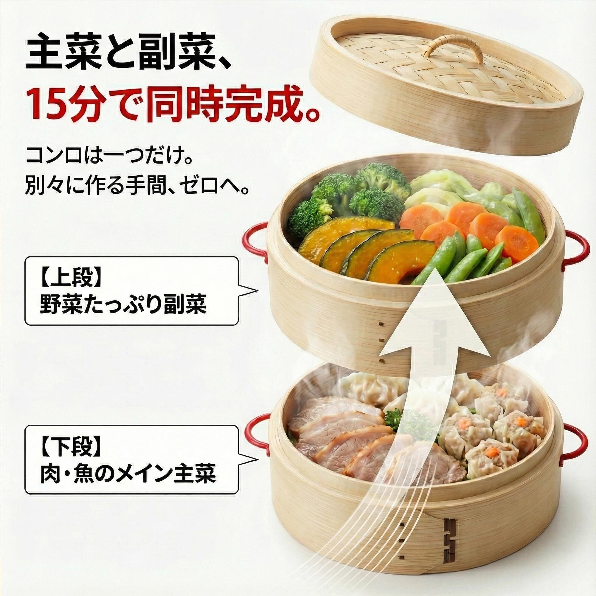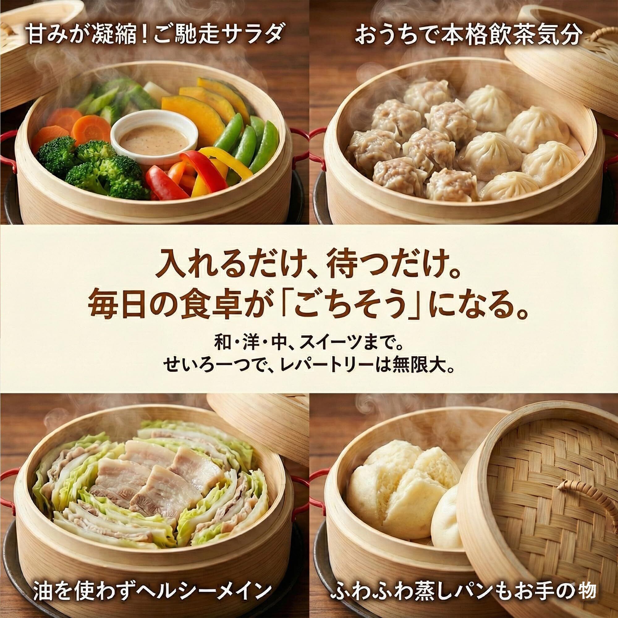 【蒸すだけ簡単・ヘルシー】 食材を入れて蒸すだけで、素材の旨みを引き出します。油をほとんど使わず、毎日の食事作りに便利です。