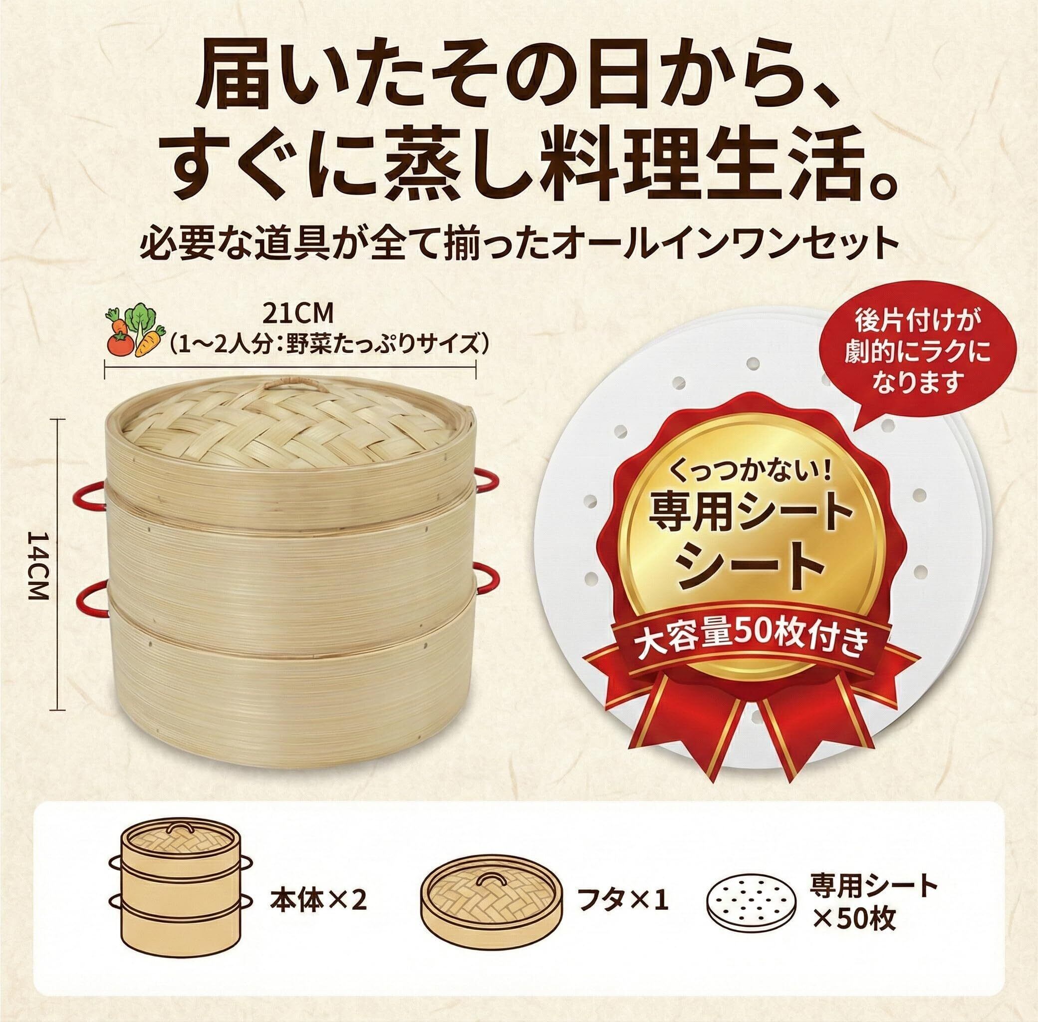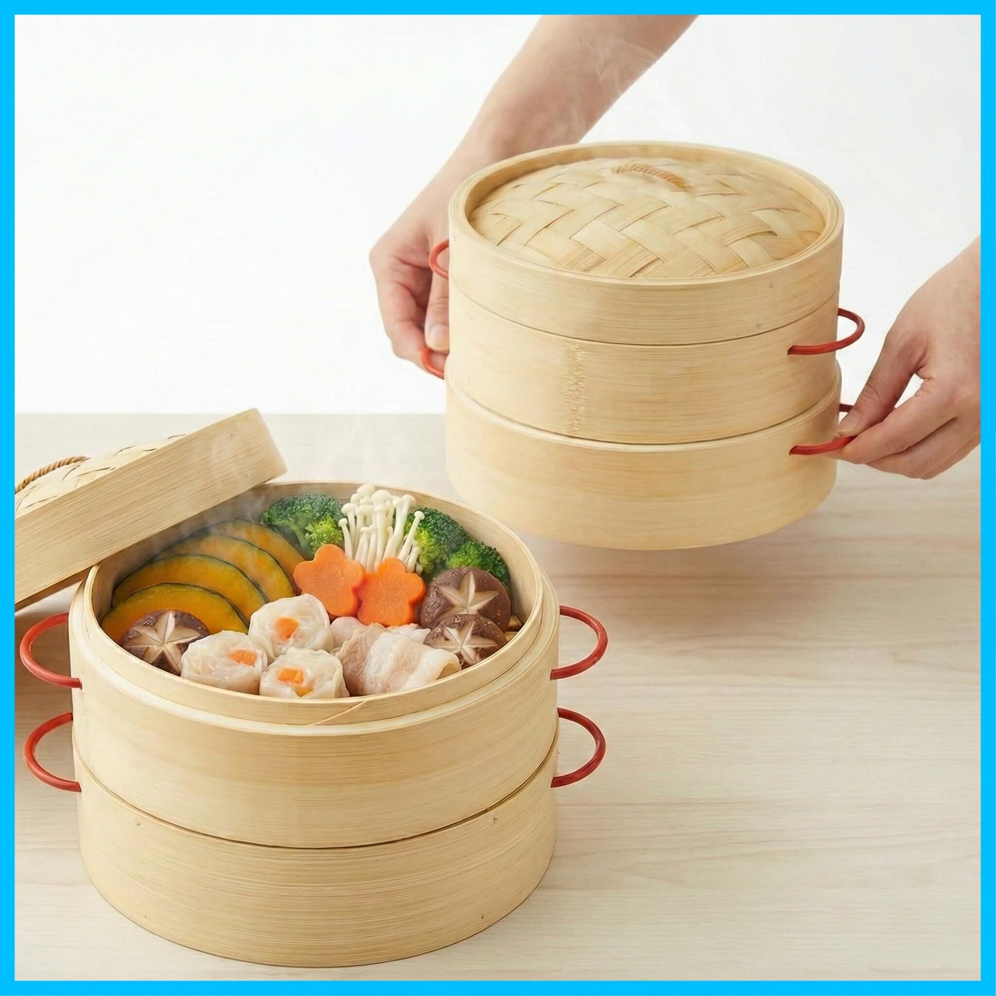 Kurasage 竹せいろ 21cm 2段 防熱持ち手付き 専用シート50枚付 中華 天然素材 蒸籠 せいろ蒸し器 本体2個・蓋1個セット 業務用 家庭用