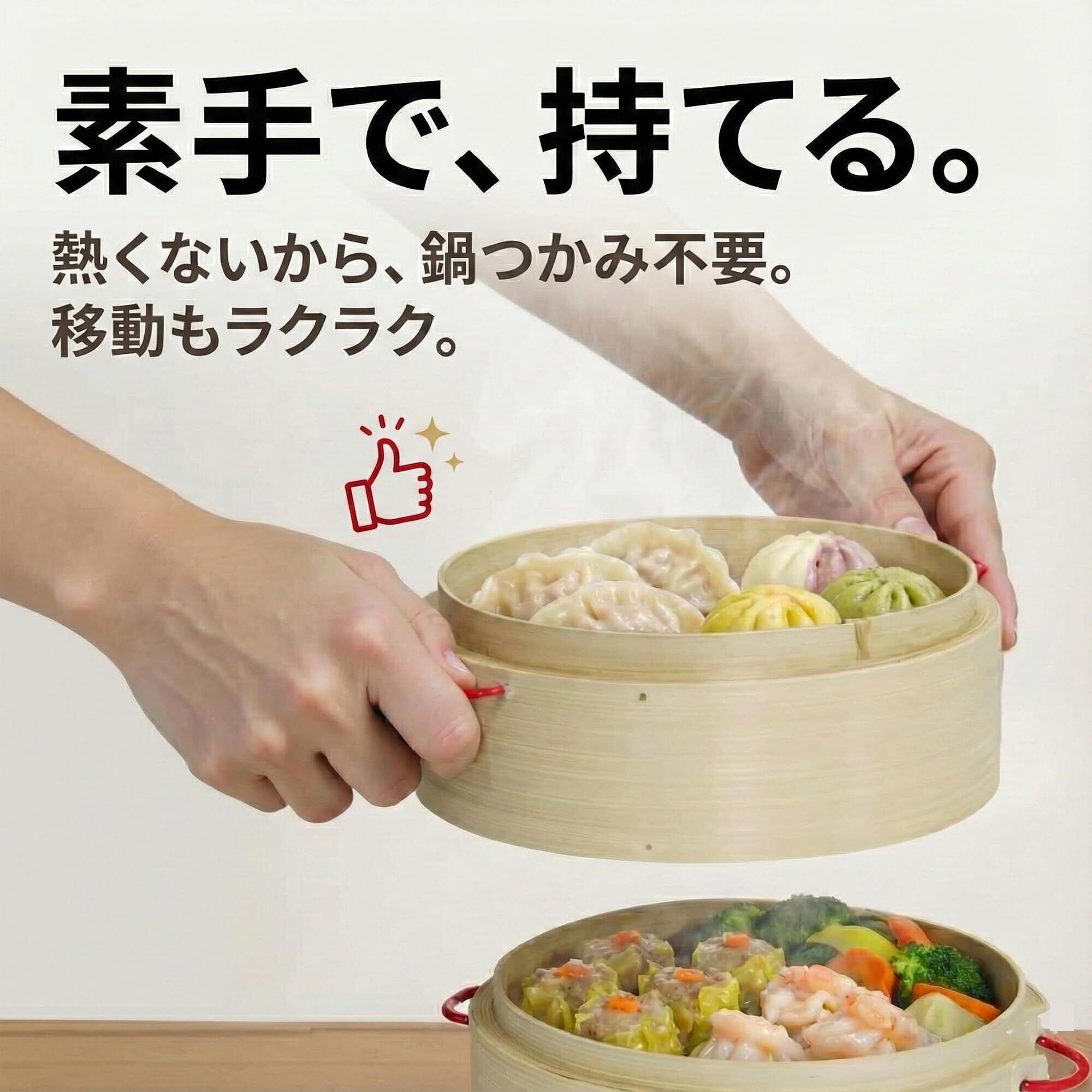 【防熱持ち手付きで持ちやすい】2段の両側に防熱持ち手を搭載。熱い状態でも持ち上げやすく、移動や取り出しがスムーズです