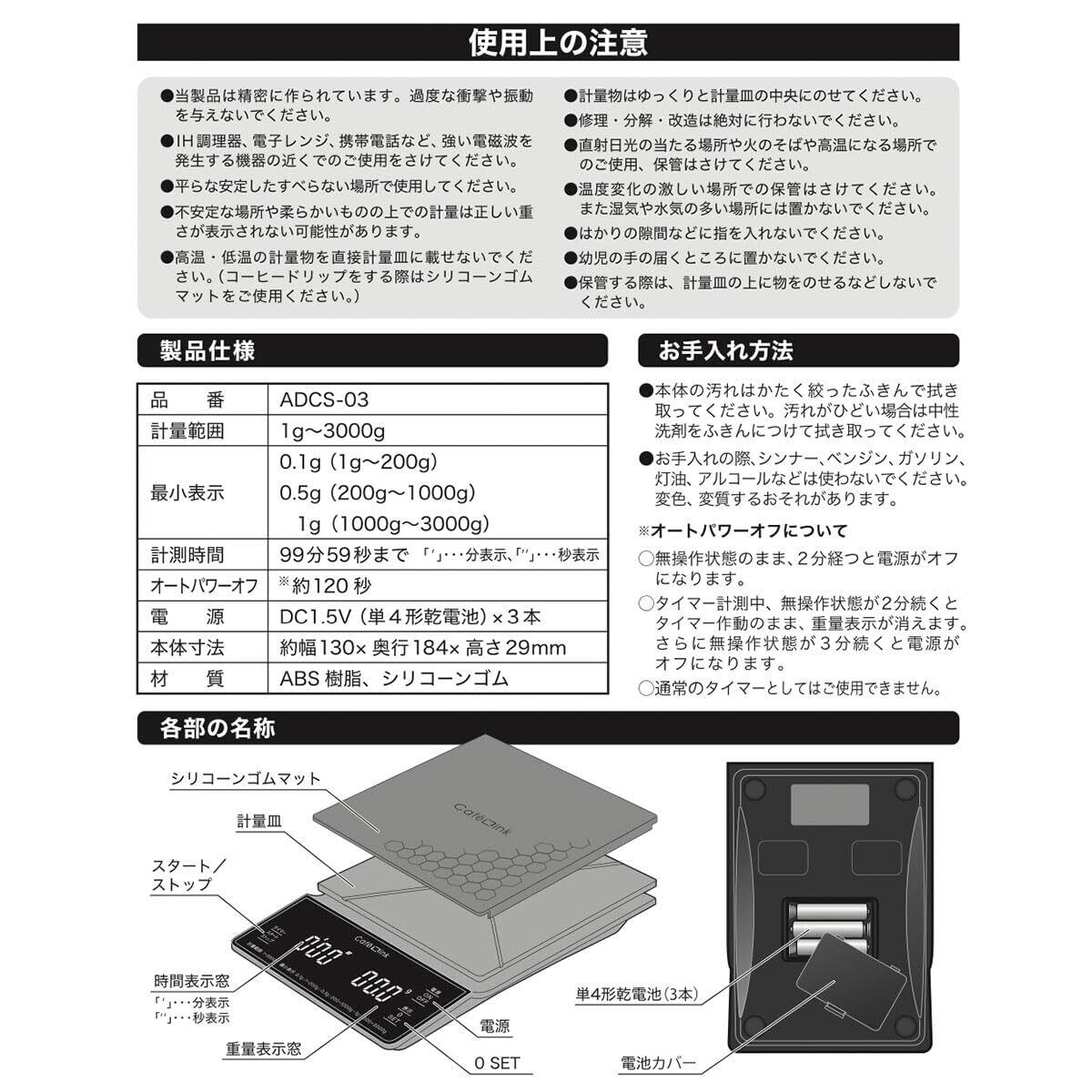 アトラス コーヒースケール ドリップスケール はかり デジタル 0.1g デジタルスケール 3kg 計量器 タイマー機能 ブラック ADCS-03