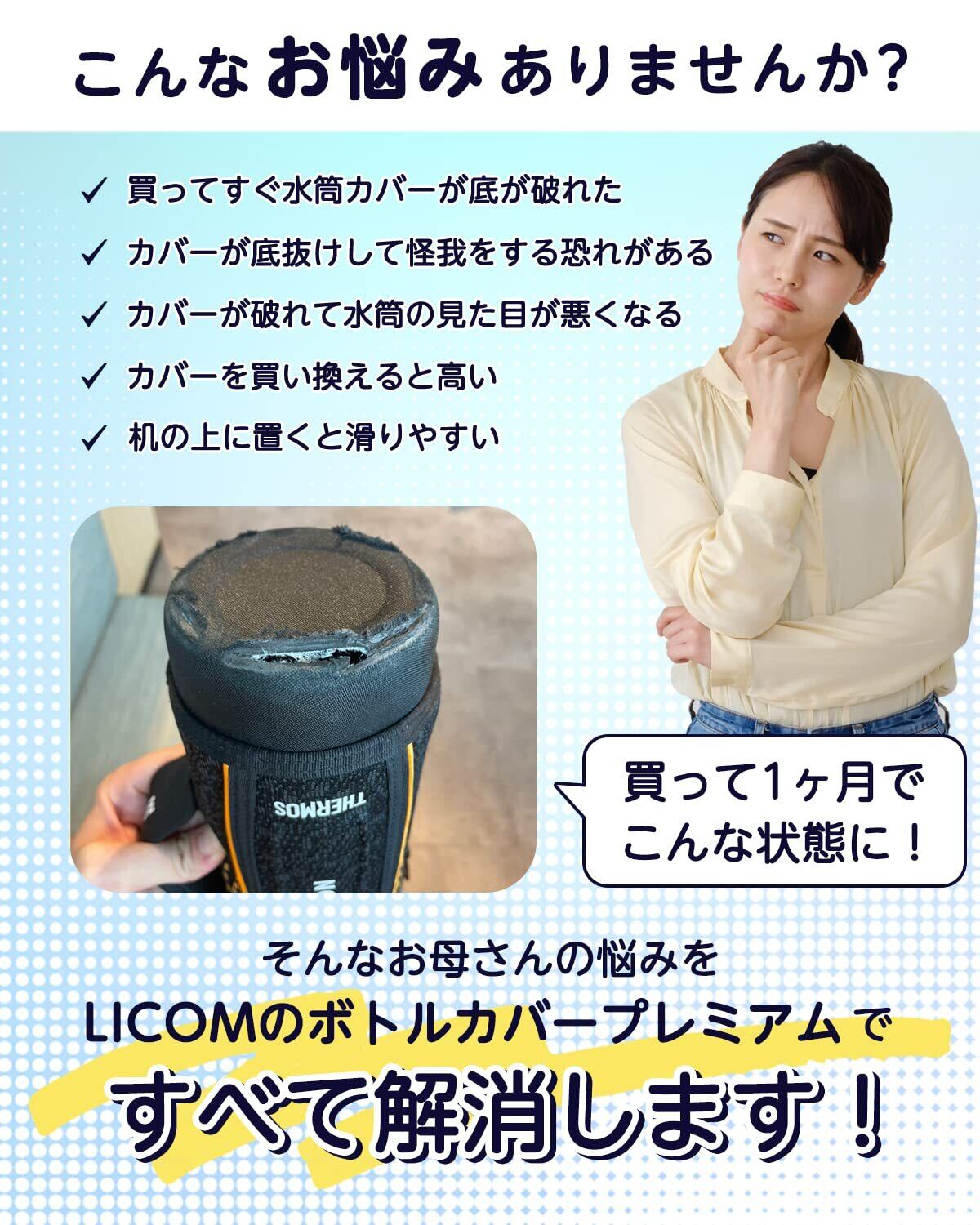 【買い替えより安い】純正の水筒カバー、水筒ポーチを買い直すと2000円くらいして、本体ごと買い替えた方がいいんじゃないか。。と思ったりしたことはありませんか?LICOMのPremiumBottleCoverなら2つで1000円ちょっとなので半額以下でお財布に優しい料金形態になっています。特にTHERMOS(サーモス)、象印の水筒カバーは高いので、本商品で安く長く使っていただけると大変嬉しいです。