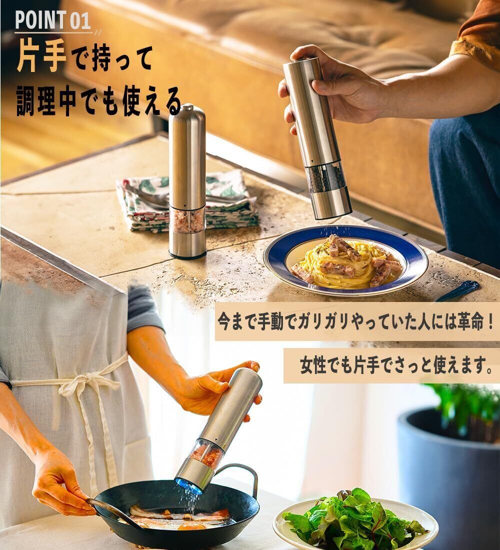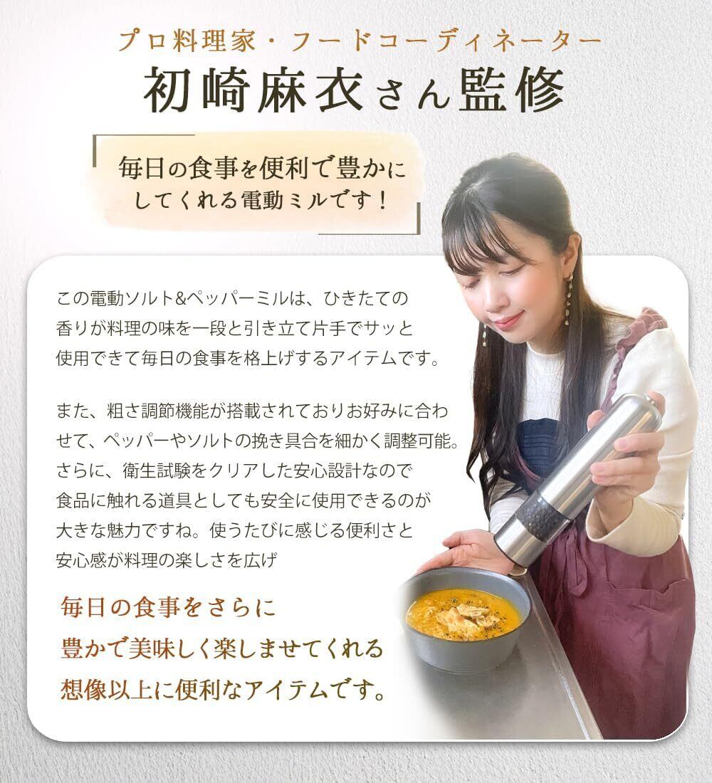 『プロ料理家監修の電動ミル!』電動のソルト&ペッパーミルです!どんなキッチンにも合うスタイリッシュでおしゃれなデザイン、置くだけで洗練された印象を与えてくれます。
