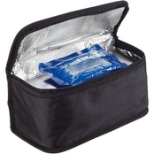 素材:表地=ナイロン(ポリウレタンコート)、断熱材=ポリエチレンスポンジ、裏地=アルミフィルム、ファスナー=ナイロン、取手=亜鉛合金、保冷剤(包装)=ナイロン/ポリエチレン、保冷剤(内容物)=高吸水性ポリマー