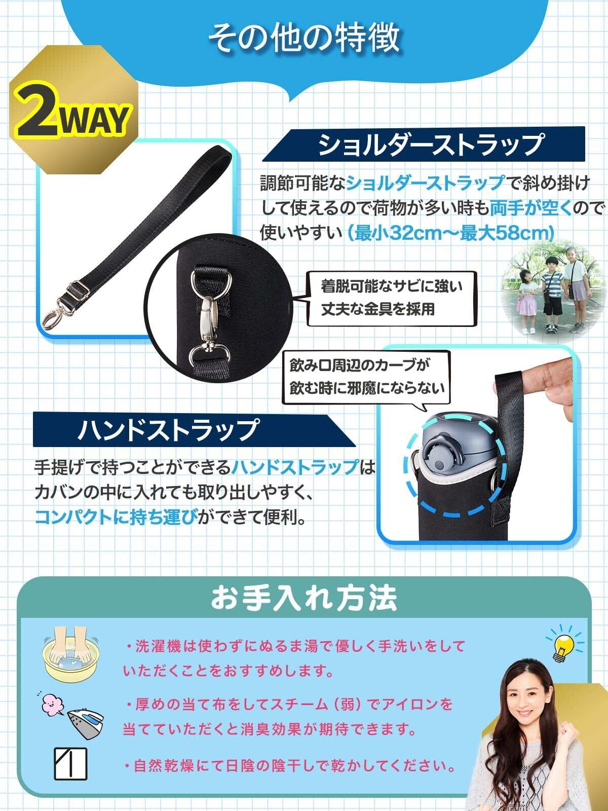 2Way:ハンド&ショルダーストラップ、推奨ボトルサイズ:480mL~500mL、(底部直径が6.5mm前後のストレートタイプにおススメ)水筒の直径7cm以上は入りません